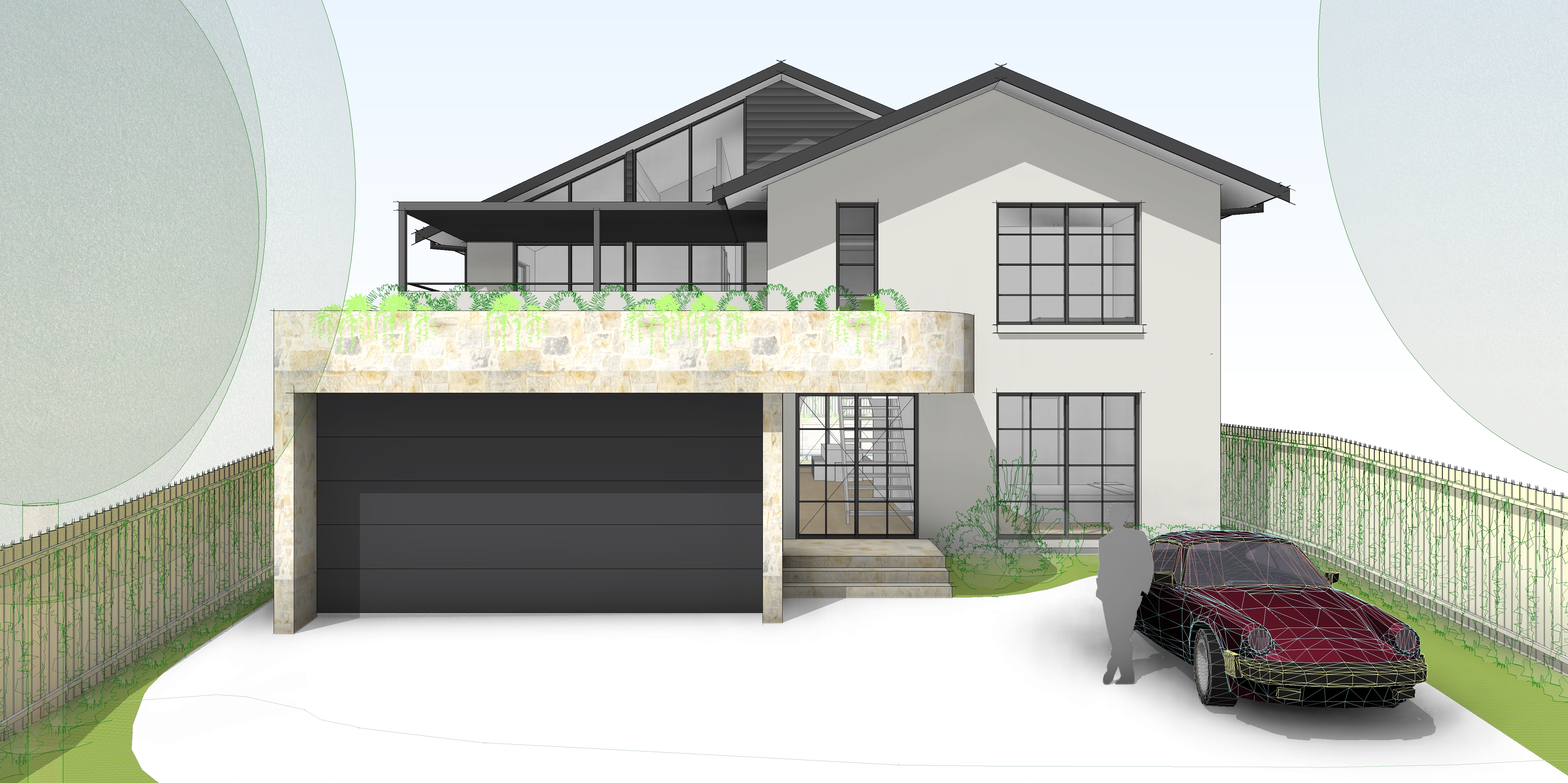 render a photorealistic 3d perspective of this house near sydney reference the current material style and enhance them black metal roof linea fibre cement cladding and sandstone walls keep model geometry the same windows doors roof walls garage door pavement driveway make a lush vegetation that looks native to australia do not change the view only enhance the current materials and make the landscape nicer vegetation detailed textures in the grass and glass reflections and a vibrant clear sky with light atmospheric depth render in hyper realistic architectural visualization quality 8k resolution