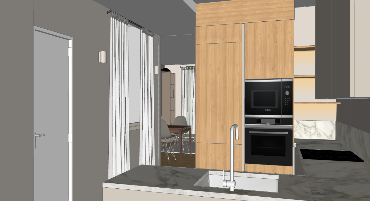 hiper realistic render this soft warm light for the wall lamps soft see through curtains light oak wood for kitchen furniture counter top kitchen with sapienstone arabescato kitchen walls also covered in same counter top material