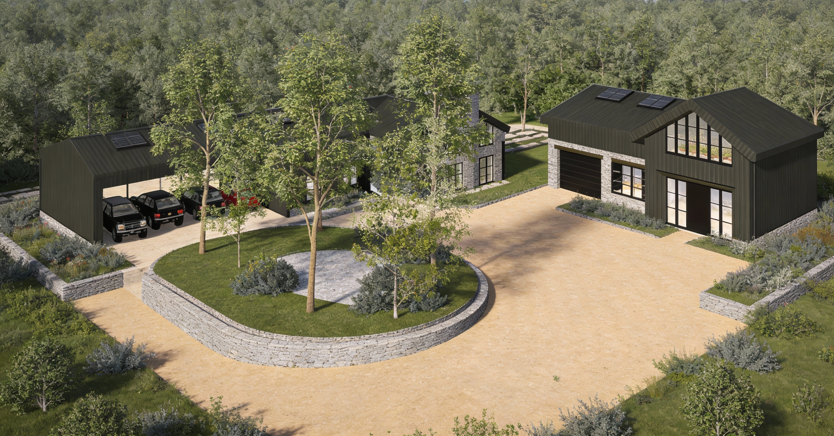 make hyper realistic this is a small cluster of houses so add some claddy dplanting to replect this and make the glass in the centre have wild planting to look stylish add planting in background and a few trees so you cant see the horizon dont change view or proportions