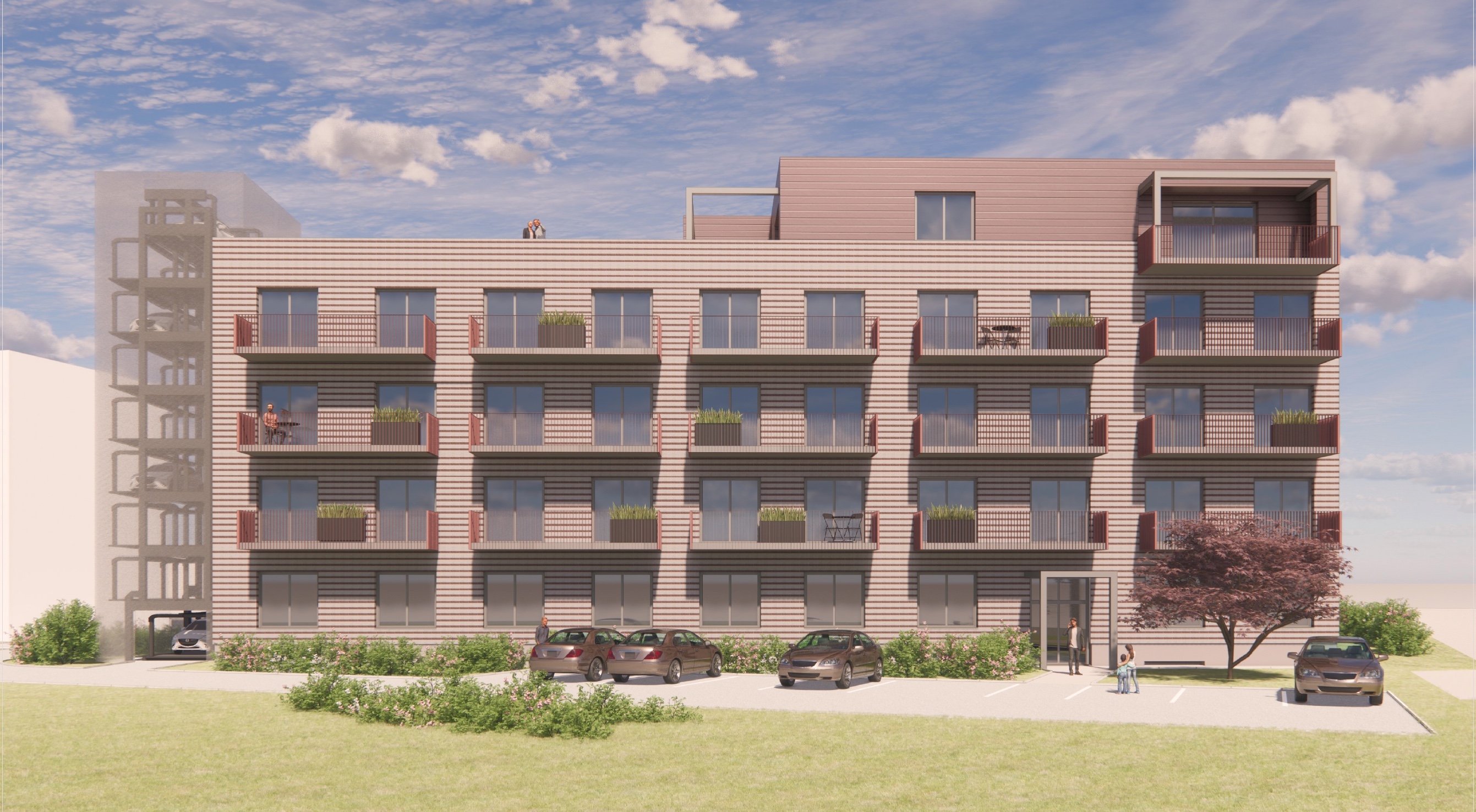 enhance this real estate exterior rendering to look like a high quality developer marketing image preserve the exact building architecture proportions balconies windows and layout do not redesign the building improve realism and presentation refine materials and textures facade glass metal railings enhance reflections in windows subtle sky and surroundings add natural imperfections for realism lighting soft warm late afternoon sunlight golden hour feel but realistic balanced exposure no overblown highlights natural shadows with depth environment improve greenery more natural variation realistic colors refine grass and plants less artificial more organic enhance tree details and shadows sky realistic sky with soft clouds and depth slightly more contrast but natural people refine human figures to look more realistic and natural subtle presence only no focus on faces cars more realistic materials and reflections slightly reduce visual dominance atmosphere clean calm residential premium but believable slight cinematic polish not stylized camera natural real estate photography look slightly improved depth and contrast do not do not change building design do not add new structures do not over saturate colors do not create unrealistic dramatic effects