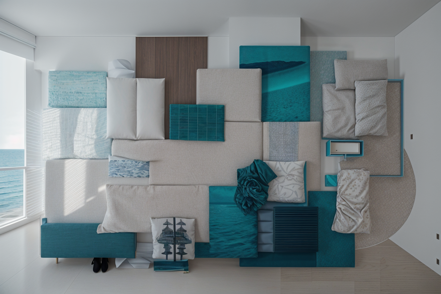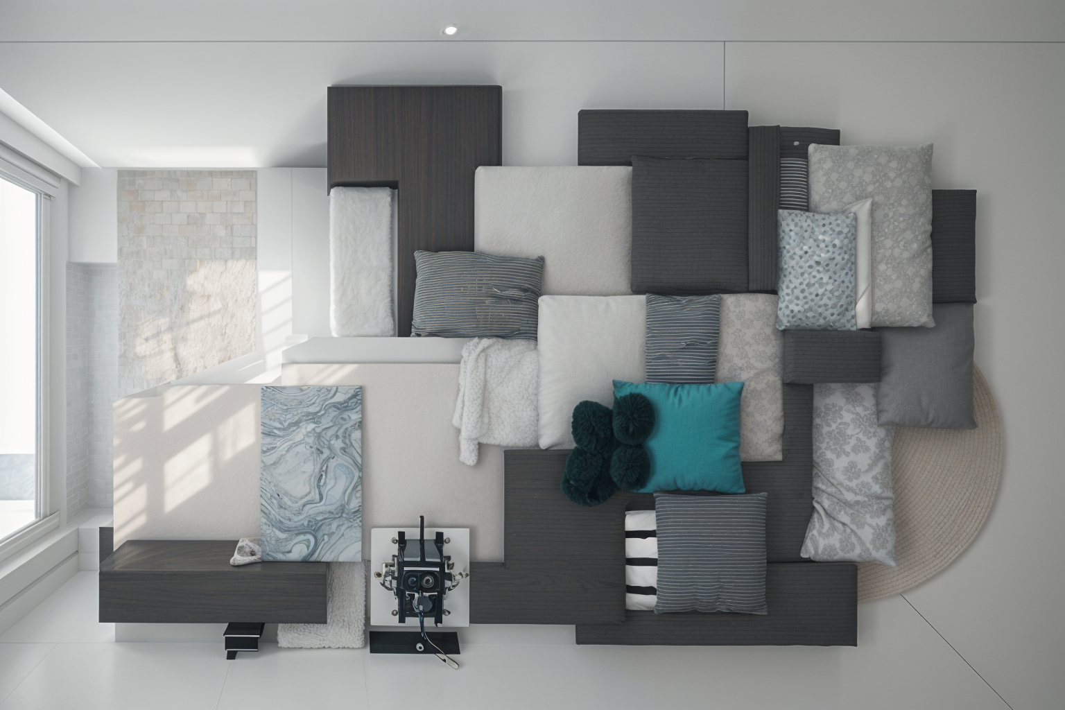 exterior shot interior shot create a moodboard based on the elements and materials from this interior render