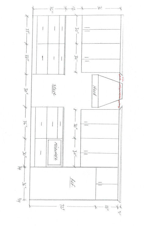 interior shot create a realistic interior kitchen rendering based on a hand drawn layout the kitchen is a clean symmetrical wall layout with cabinetry on both sides and a centered cooking area cabinetry is brooklyn white painted finish in a classic shaker style with full overlay upper and lower cabinets run along both walls with a balanced built in appearance a centered feature hood sits between cabinet runs the hood is brooklyn white with a contrasting brooklyn oak fawn wood trim band as a decorative accent the hood is simple box style not ornate countertops are a white surface with subtle light veining soft movement resembling a taj mahal quartzite look use a clean eased edge profile backsplash is white herringbone tile matte finish running from countertop to bottom of upper cabinets hardware is warm brushed gold pulls simple modern style not ornate flooring is tan oak wood flooring natural finish medium plank width warm tone include a built in microwave base cabinet on one side as shown in the plan overall style is transitional and warm not modern stark and not traditional heavy soft inviting and clean lined walls are a soft warm white to complement cabinetry lighting should be recessed ceiling lighting only producing natural even illumination keep the design minimal and architectural no excessive decor or staging focus on cabinetry symmetry and material contrast camera view should feel like standing in front of the kitchen slightly wide angle but not distorted