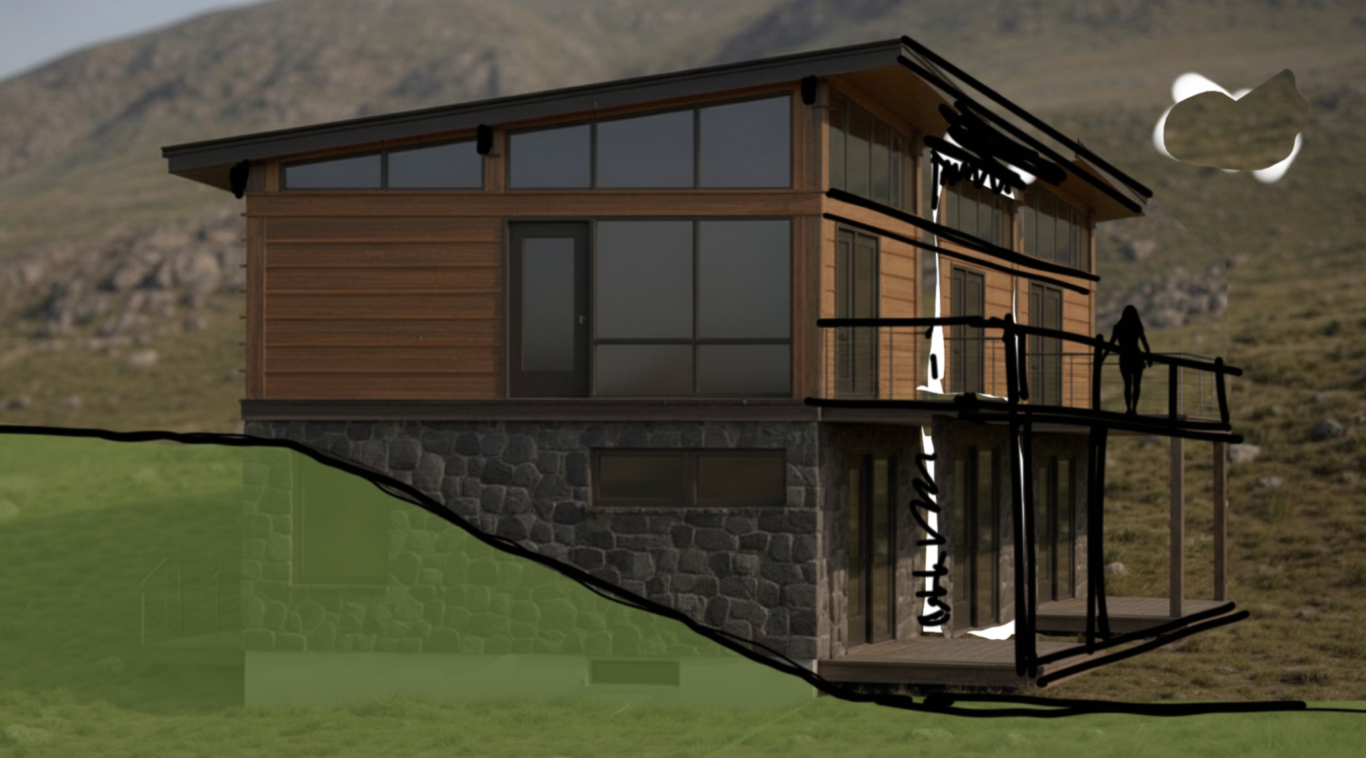 show this small modern house built into a hill and surrounded by lush modern zen landscaping with large rocks add lots of trees around the house to give a sense of privacy warm sun is reflecting off the windows and throughout the house