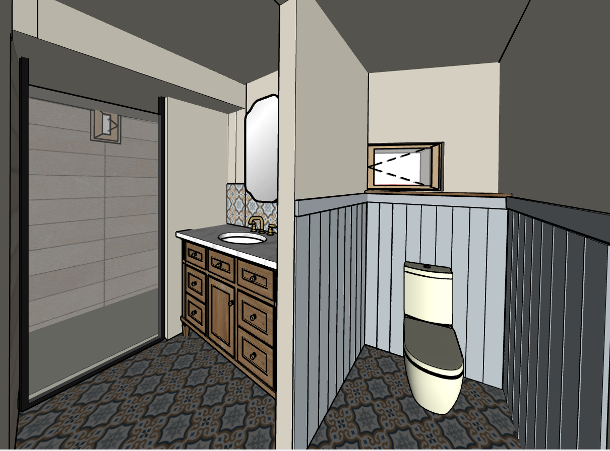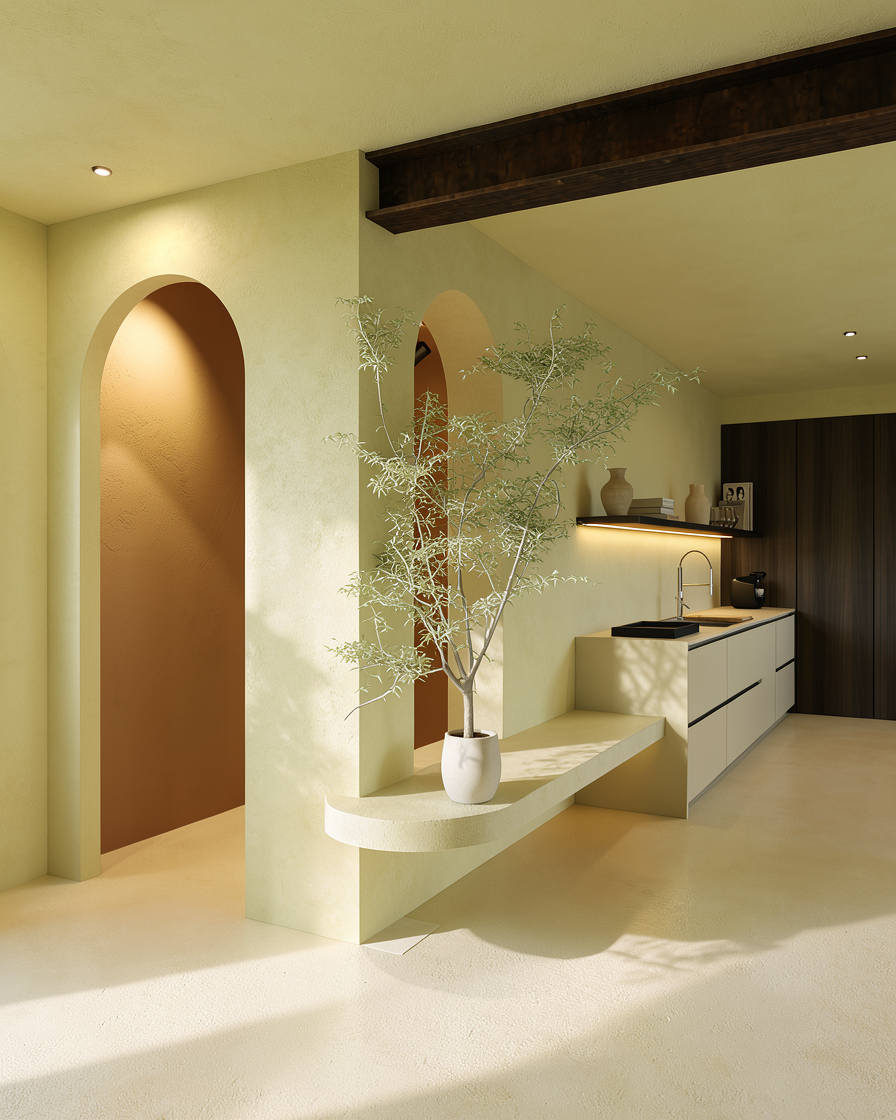 transform this sketchup model into a photorealistic architectural render keep the exact geometry proportions and layout of the model materials realistic textures with natural imperfections wood grain stone texture matte paint lighting soft natural daylight coming from windows global illumination realistic shadows style high end contemporary interior design with warm and elegant atmosphere add realistic details such as furniture fabrics reflections natural light bounce subtle ambient occlusion and depth camera architectural photography style wide angle 24mm eye level perspective render quality ultra realistic high resolution professional architectural visualization