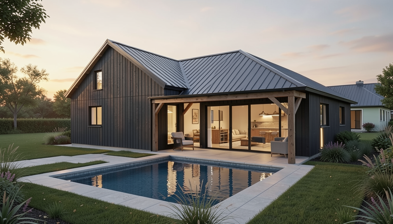maak een fotorealitische render uitzicht op een stadstuin door de schuifdeuren graag een horizontale lamp boven de het keukeneiland toevoegen geen ramen tussen de keuken en aan de linkerkant vloer als een egale gietvloer geen planten toevoegen
