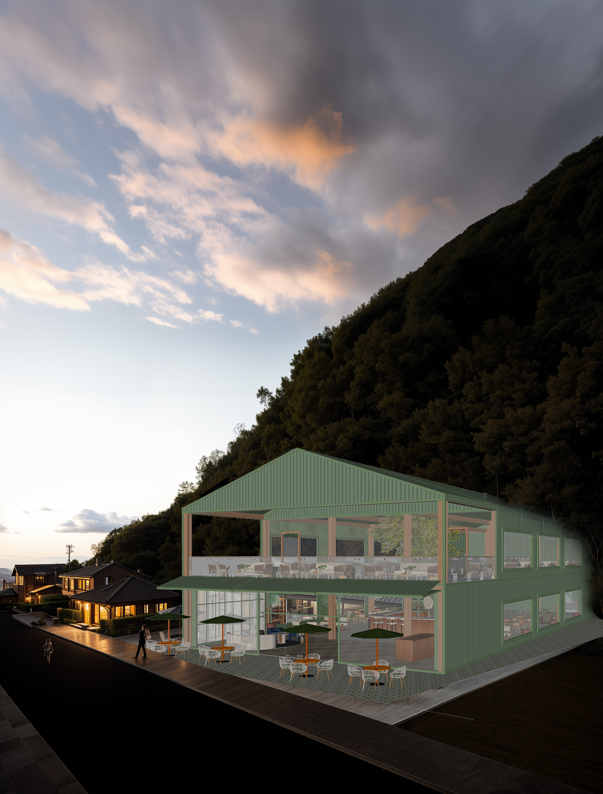 render the raw 3d architectural drawing into a realistic eye level perspective the project is located in a hillside neighborhood of labuan bajo facing the sea in front of the building show a small local road with pedestrian activity blending naturally into the neighborhood setting behind the building depict the back of the hill with dense tropical vegetation and rocky textures suggesting a natural cliff terrain surround the site with neighboring houses to convey a coastal residential atmosphere highlight warm tropical lighting realistic material finishes and the calm sea horizon to evoke the character of labuan bajo s hillside environment