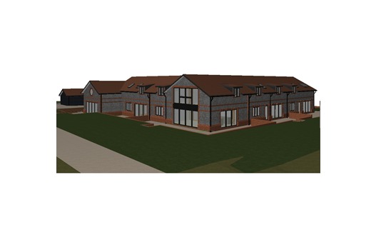 geenrate a hyper realitic visual of my architects design this is a arn conversion into a number of houses the roof is red riles and the walls are grey flint with red brickwork detailing