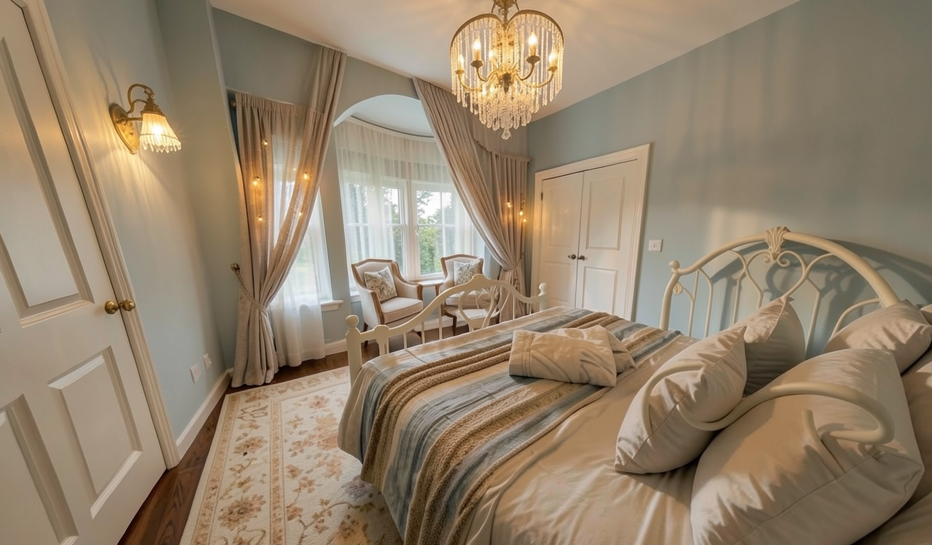 create a cozy bedroom with hanging elegant icicle chandeliers in drywall cased openings