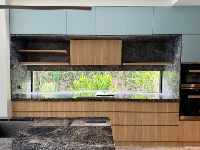 change the back of the shelving area to a very skinny thin rectangular duck egg blue zelligue tile and remove the second shelf to the left side remove the top one keep the sides as the existing marble keep everything exactly the same otherwise