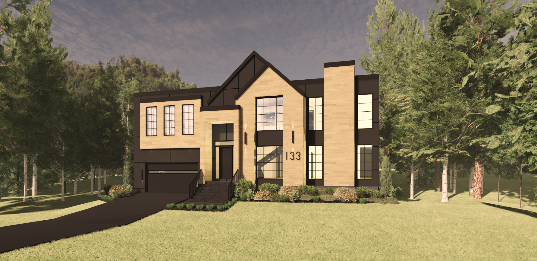 modernist exterior shot modern home with light overcast sky after a rainstorm photorealistic the photo has a striking black siding contrasted with the wood horizontal paneling the driveway is in asphalt and the house is nestled in a suburban forrest area there are no other structures nearby the foundation is painted dark and the steps are a charcoal stone the front yard is lush grass architecture