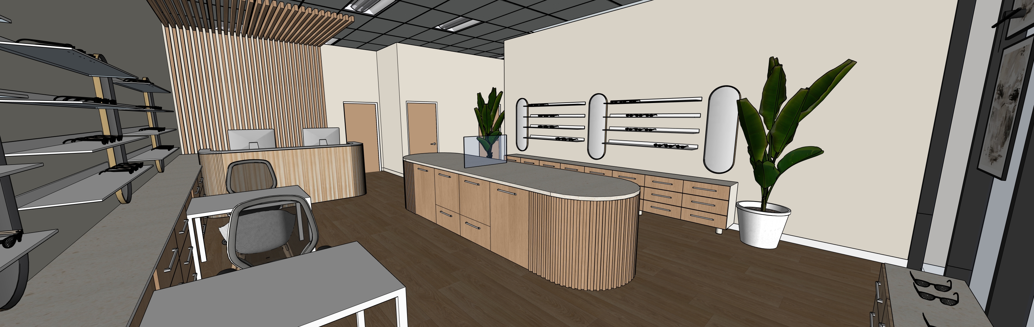 add nice bright but warm soft lighting internally add natural light shadows add reflections to the oval mirrors to the walls ensure the timber elements have a soft texture ensure the ceiling and grid is all white remove the lighting behind the ceiling battens