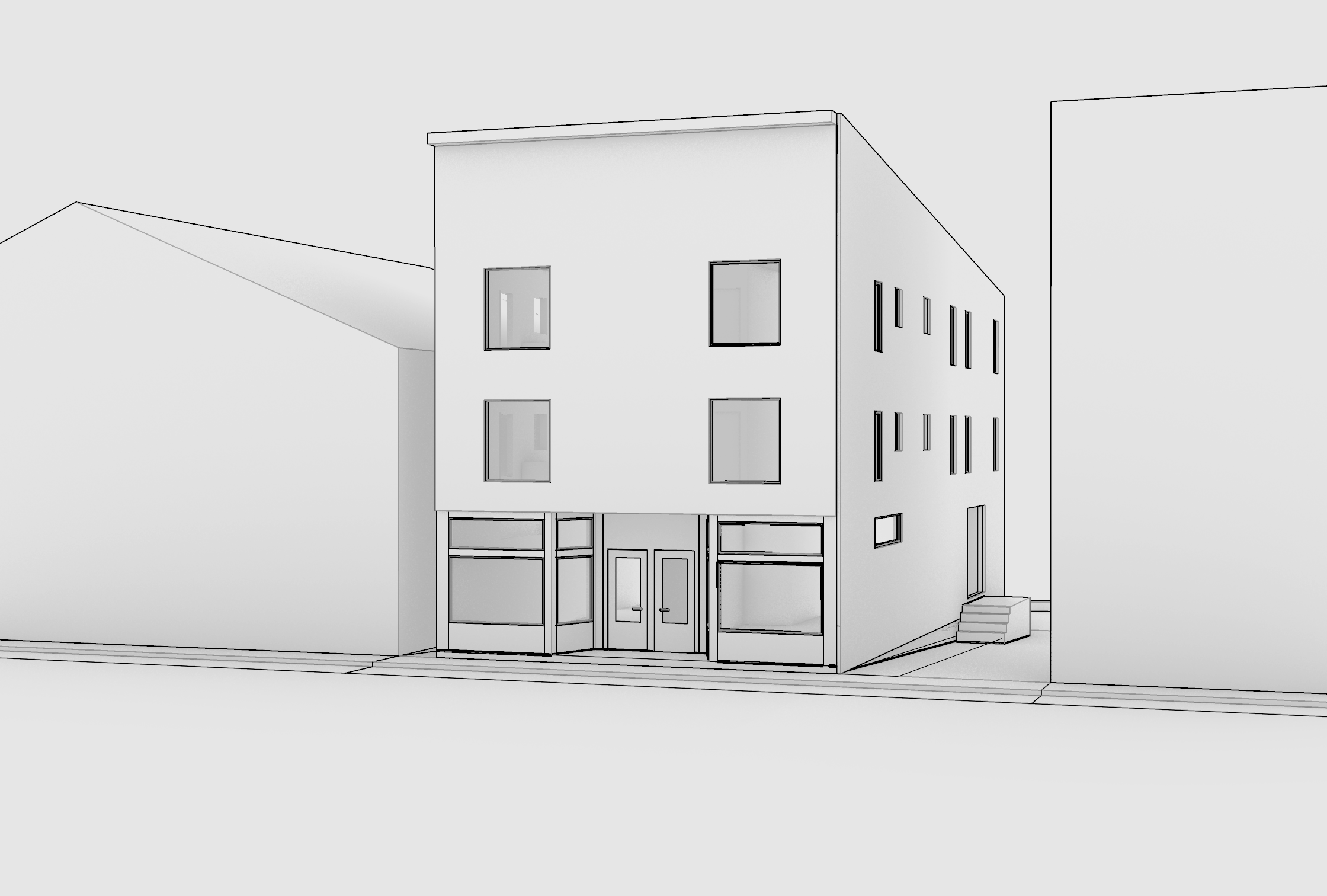 render a modern minimalist building on an urban street use soft white and light gray for the building s facade the windows should be reflective glass with subtle blue tints the doors and frames should be charcoal gray create a serene atmosphere with a clear blue sky and soft shadows add vibrant green plants along the sidewalk to enhance the welcoming environment
