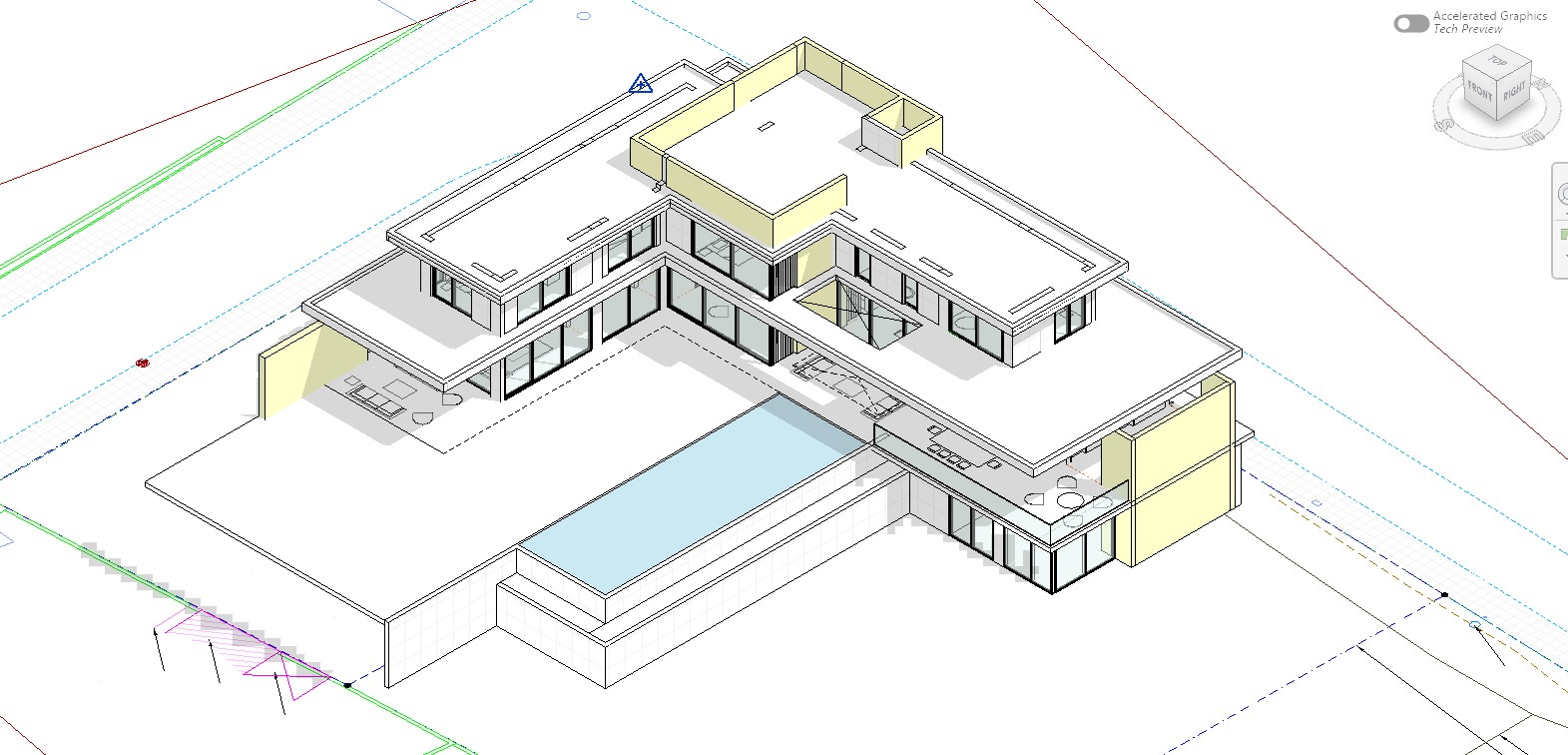 ultra realistic architectural exterior render using the exact original geometry with no changes to massing proportions roof shapes floor heights or window positions preserve the existing l shaped u shaped villa layout around the central courtyard and pool exactly as modeled contemporary luxury villa with flat roofs strong horizontal lines layered volumes floor to ceiling glass with dark frames seamless indoor outdoor connection light beige stone or brick fa ade with subtle horizontal texture deep roof overhangs forming shaded terraces minimalist european modern style manicured lawn soft landscaping surrounding trees soft natural daylight and optional golden hour version high end architectural photography look global illumination realistic reflections soft shadows ultra detailed photorealistic no geometry edits no added volumes no removed elements no changed proportions no stylization no fantasy no cartoon no distortion no low detail