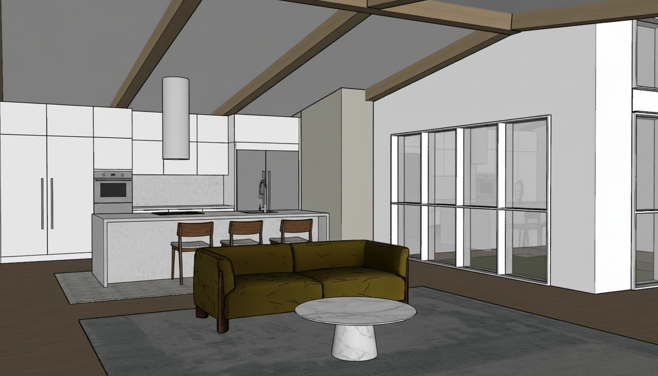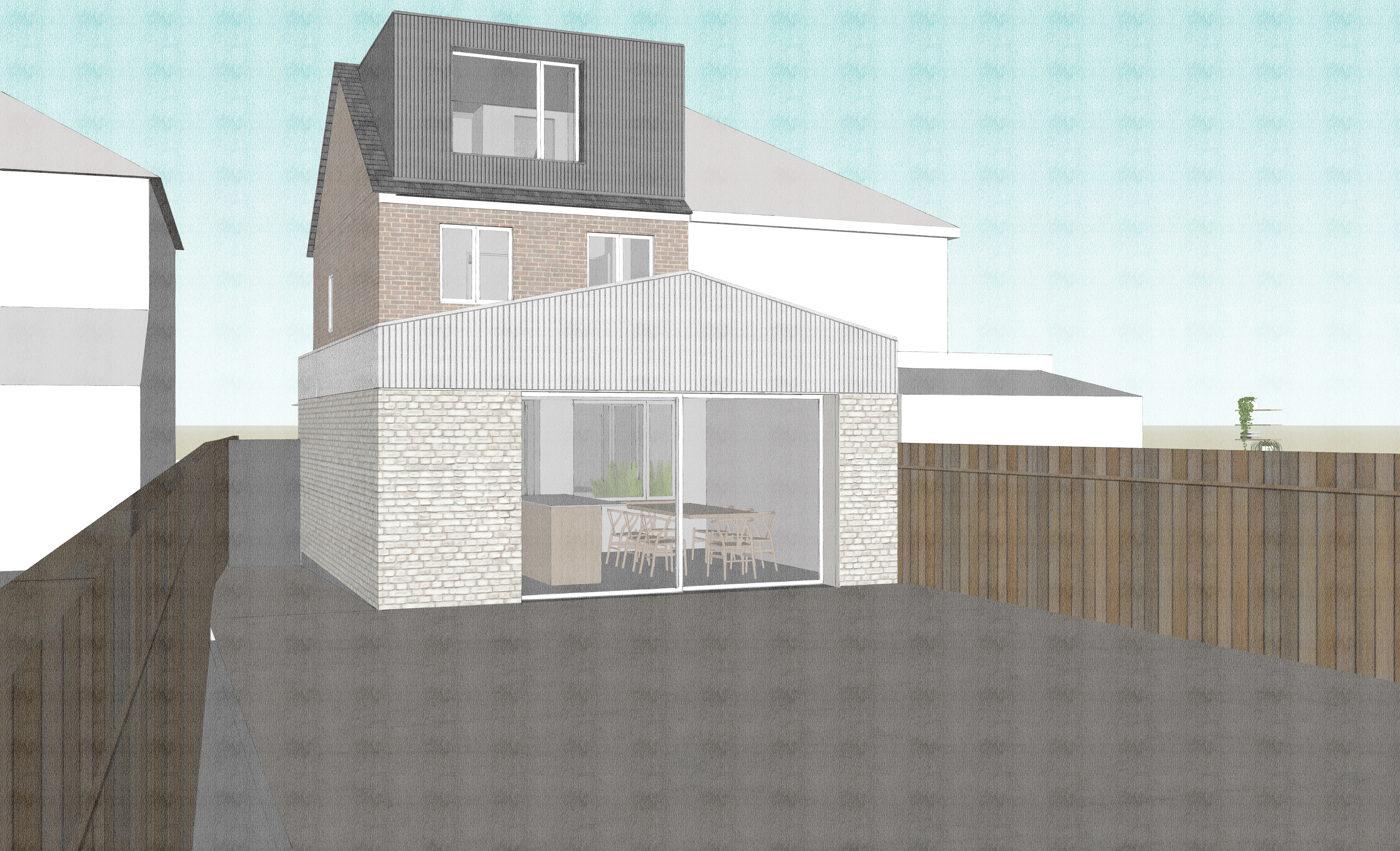 create a serene atmospheric perspective image with soft diffused lighting and minimal reflection the quality of the image is ethereal with soft lighting and slight haze and the image appears like the style of forbes massie make it a late afternoon scene with a moody grey sky and some birds flying and a warm glow coming from inside the house the extension has pale mortar washed brick walls with square profiled white hit and miss aluminium cladding above the same cladding is on the dormer in a charcoal colour the garden in the foreground is a lawn with an established shrub and herbaceous planted border in front of the fence and some medium size trees in the foreground there is a neat dark brick patio in in front of the sliding doors with pale mortar in a stack bond