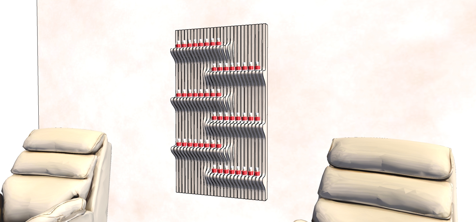 transform the provided image into a high end photorealistic interior render keep the exact composition and geometry enhancing realism with natural lighting soft shadows and refined materials the front wall should feature a subtle limewash line wash plaster texture in a warm neutral tone apply the same exact wall texture to the left wall to maintain visual continuity add a warm backlight behind the parametric wooden display piece approximately 2500k the backlight must emit only from the sides top and bottom edges of the piece there should be no light coming through the center or between the wooden slices the light should create a soft halo effect around the perimeter emphasizing depth while keeping the interior of the piece unlit the parametric wooden structure should appear premium with realistic wood grain smooth edges and a refined finish change the nail polish bottles to multiple different colors using a soft spa inspired palette nude blush terracotta muted reds soft pinks avoiding uniformity or repetition maintain a calm luxury spa atmosphere with balanced contrast realistic shadows and subtle reflections ultra realistic architectural visualization professional interior render