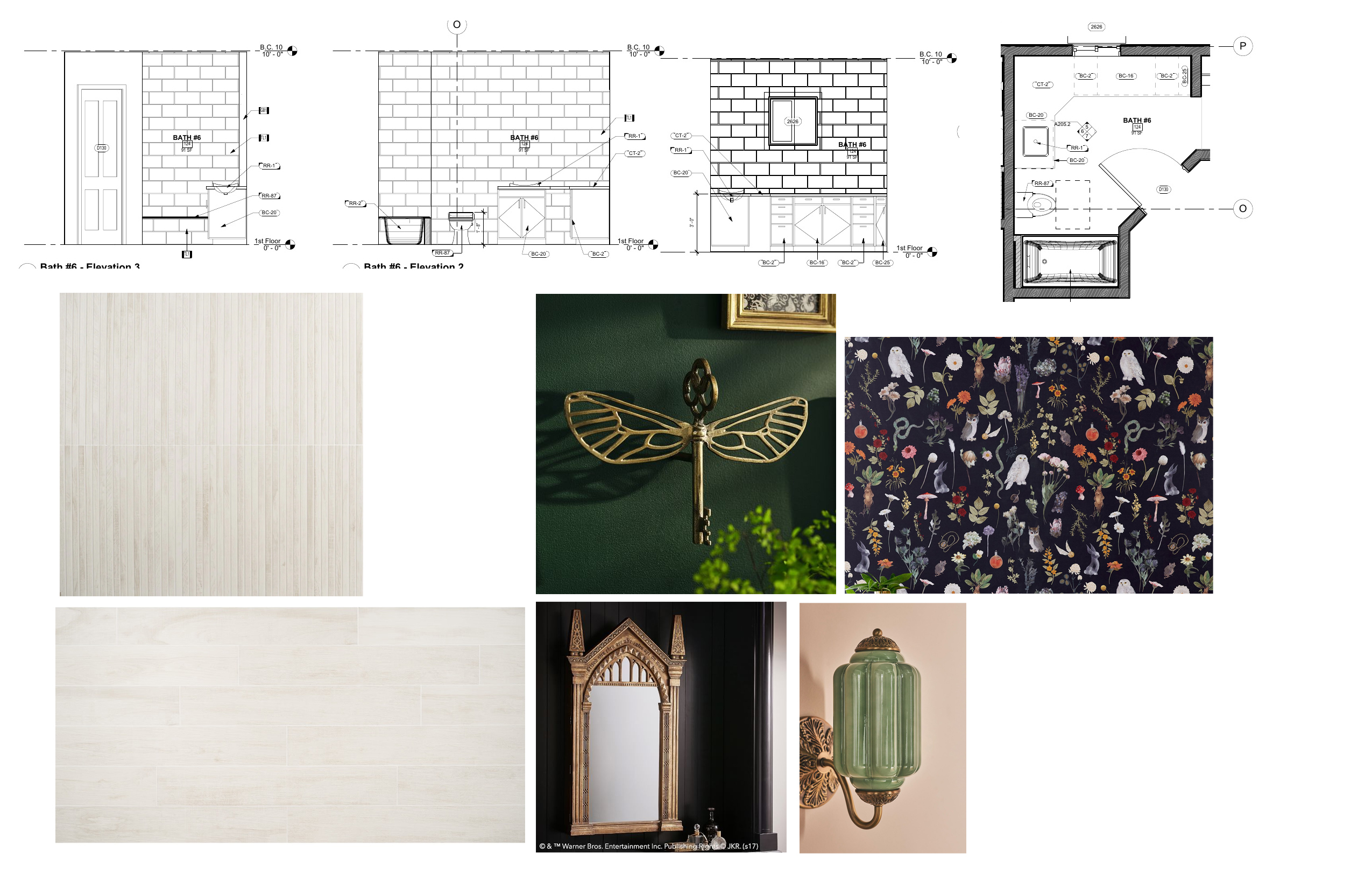 render the bathroom elevations using the finshes on the sheet make the vanity a forest green color