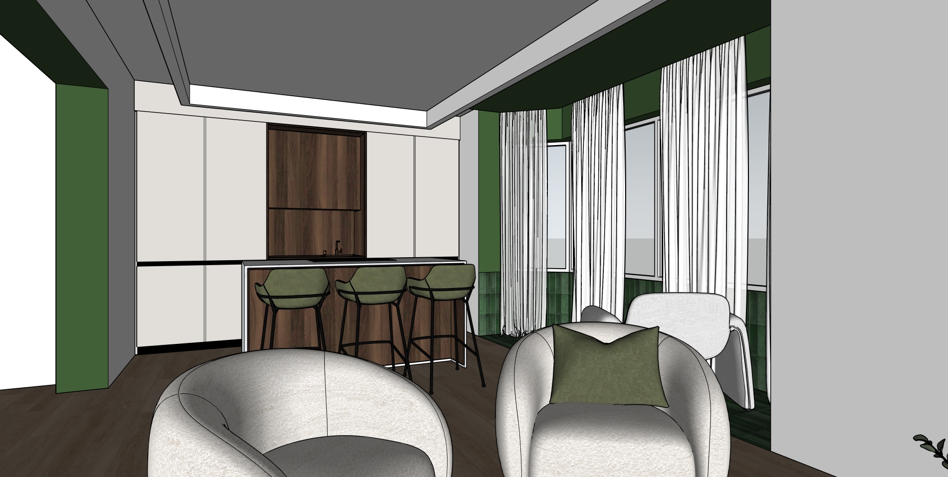 crea una imagen fotorrealista a partir de este sketchup cuidado los azulejos de la terraza llegan hasta el comienzo de la ventana a media altura