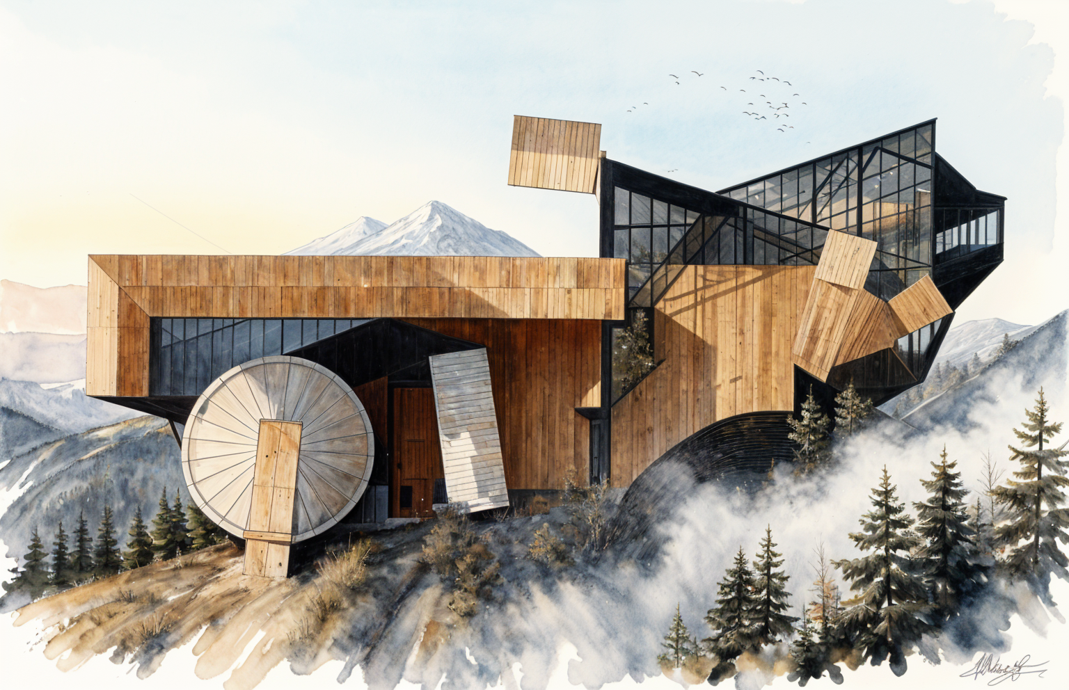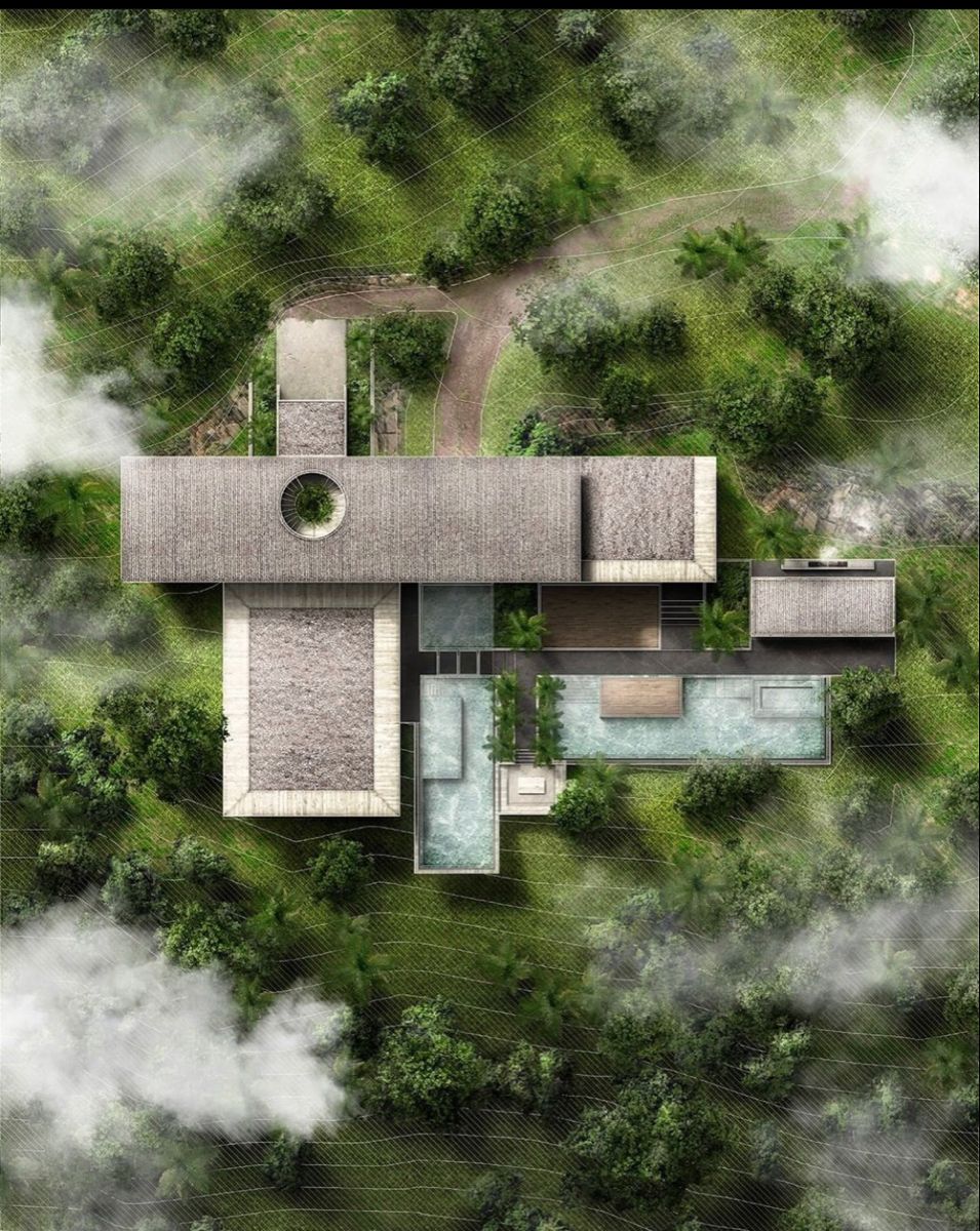 aerial shot top down view of an architectural masterplan dramatic lighting and shadows high contrast cinematic perspective subtle depth with soft ambient shadows emphasizing buildings roads landscape and water features lush greenery reflective surfaces vibrant yet realistic colors aerial view with slight tilt cinematic composition high detail atmospheric haze ultra realistic textures architectural visualization style sharp lines volumetric light
