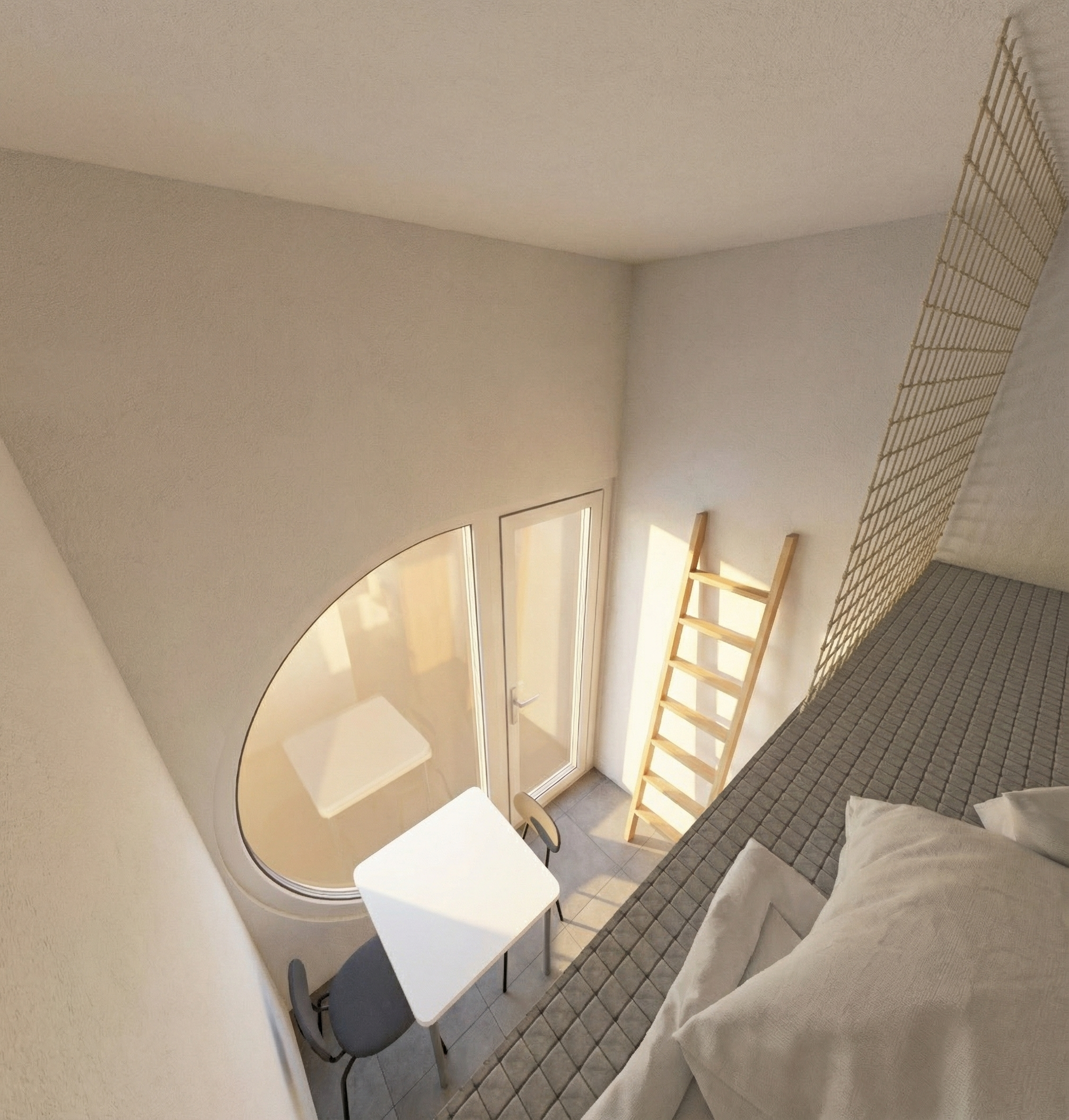 add light wooden ladder on the wall on the right side turned to wall closer to the cabinet add net railings over the bed you look through net add more sun light outside the window wooden deck and grass