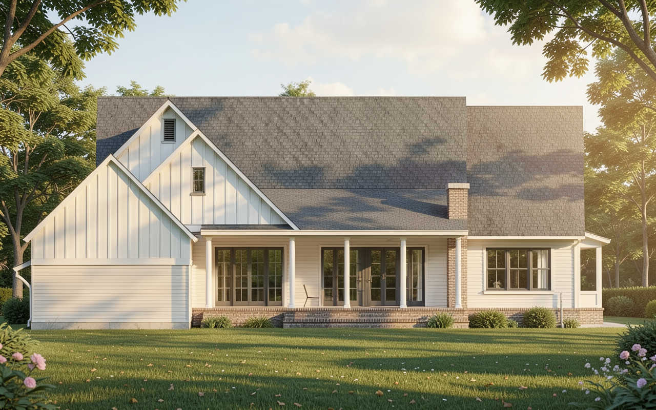 this is the backyard add a contemporary looking square in ground pool and an outdoor kitchen put contemporary reclining chairs by the pool put bathing deck with reclining chairs in the shallow end of the pool put an elevated hot tub at the other end of the pool see 2nd rendering make the yard a lot bigger this house will sit on several acres of cleared and manicured land white or very lightly off white exterior charcoal gray metal roof black framed windows these are in most new builds let s make the plants tress a little more tropical with palm trees palmetto pindo mexican fan palm european fan palm windmill palm crepe myrtles it s nice to use live oaks water oaks southern pine trees loblolly pine and ground foliage let s try not to have the trees block the view of the house