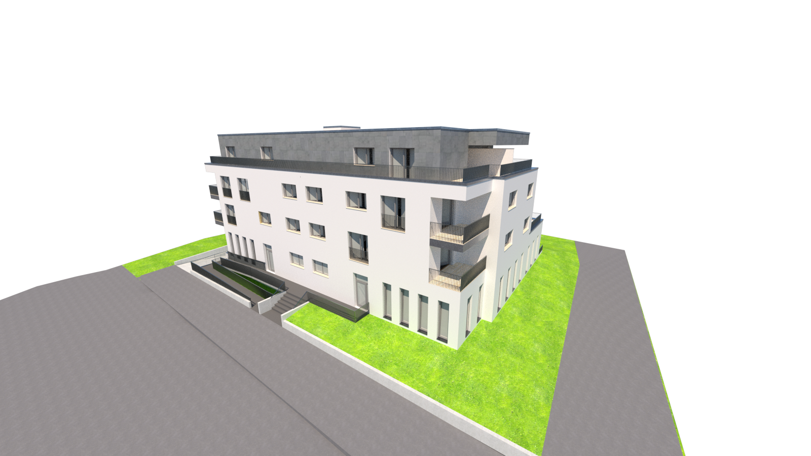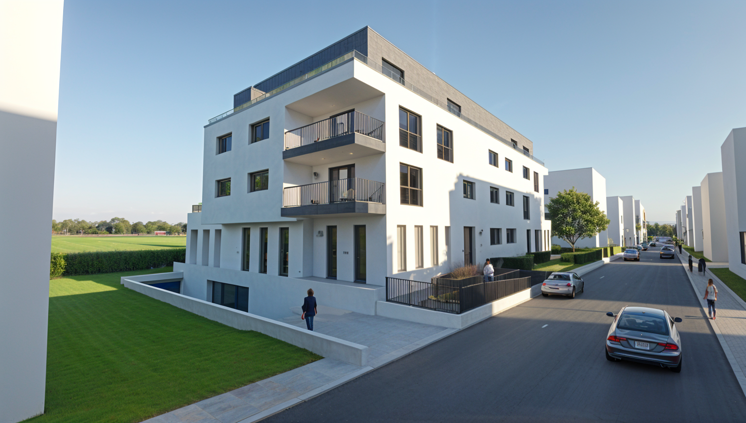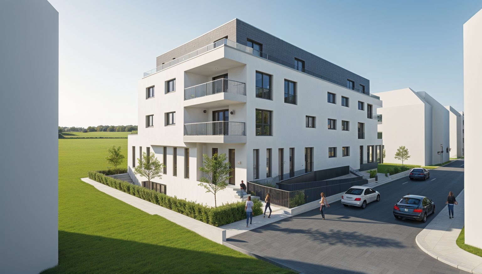 richard rogers exterior shot links hinter dem geb ude sind felder und wiesen vor dem geb ude verl uft eine strasse geb ude in der umgebung nur als wisse volumen darstellen b ume hecken personen und autos hinzuf gen links vom geb ude ist die garageneinfahrt diese soll frei von pflanzen sein architecture