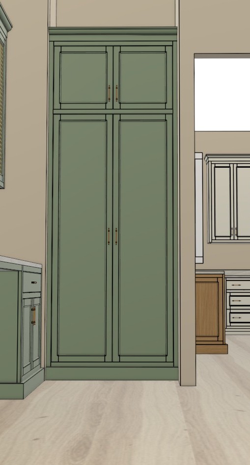 the green cabinets are farrow and ball breakfast room green the wood grain cabinets are rift white oak the white cabinets are white dove