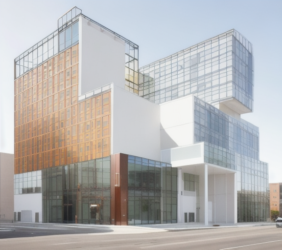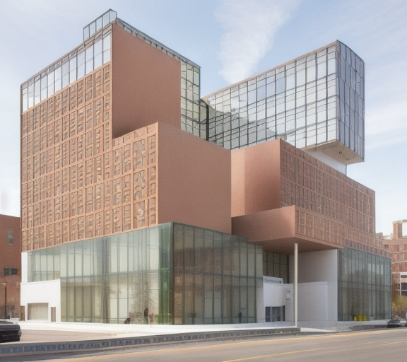 kengo kuma exterior shot street view building warm building lights soft colors urban tall buildings background sunny day landscape people cars architecture
