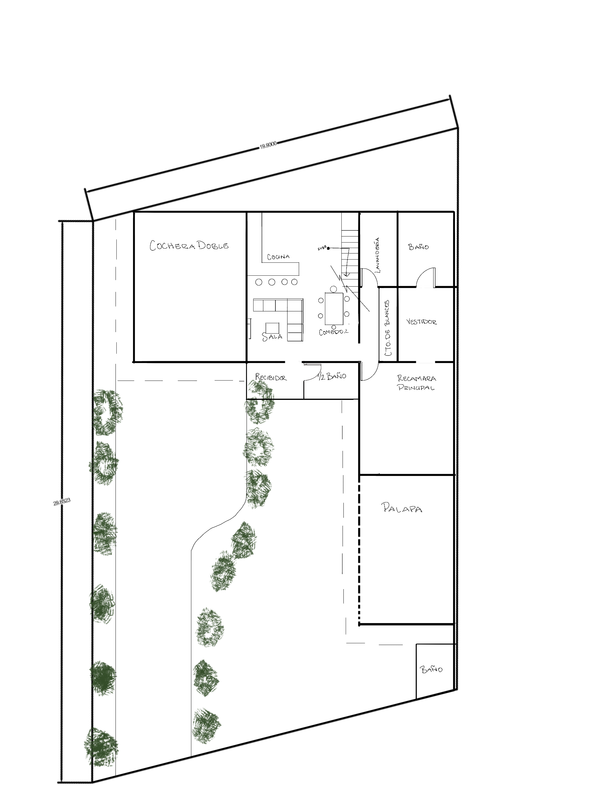 transform this hand drawn floor plan into a clean professional 2d architectural drawing maintain the exact layout and proportions of the original sketch use the lot size as reference 19 90 m x 30 00 m draw all walls with uniform thickness of 15 cm ensure proper scale and proportion relative to the lot dimensions clearly define doors and windows with standard architectural symbols add basic furniture beds sofas dining table kitchen bathroom fixtures scaled appropriately use clean black lines on a white background technical cad style straighten all lines and improve geometry precision keep a top down orthographic view no perspective use different line weights thicker for walls thinner for furniture do not change the original design only refine and clean it optionally include room labels bedroom kitchen bathroom etc if dimensions are visible replicate them proportionally style minimalist architectural floor plan cad like professional high contrast
