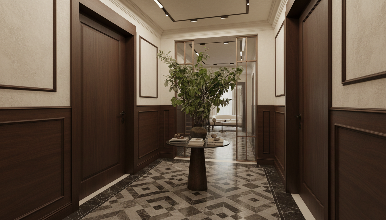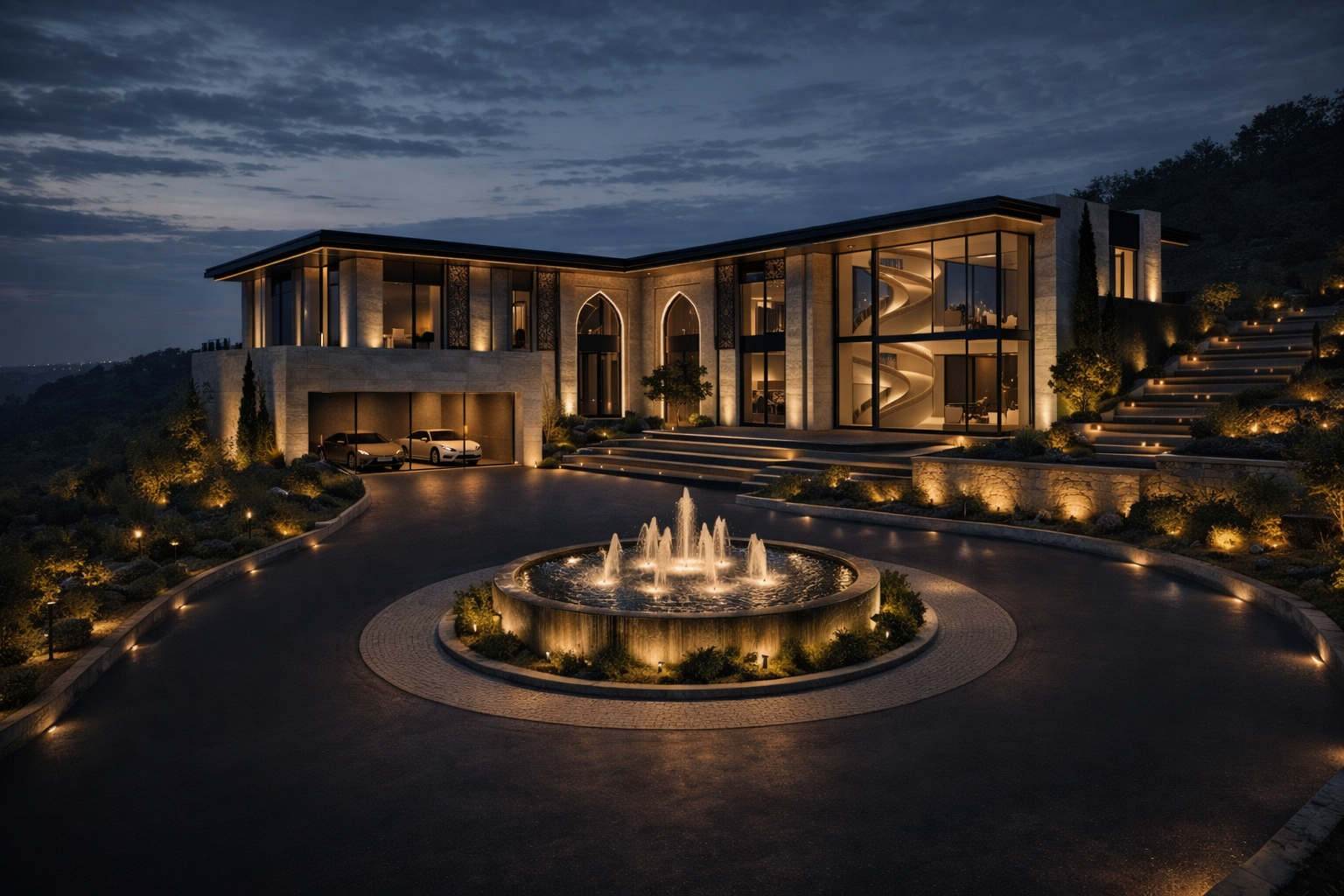 refine and elevate interior details visible through the glass introduce high end contemporary furniture with a cohesive luxury palette custom sofas sculptural lounge chairs stone and wood finishes curated d cor and subtle architectural lighting ensure interiors feel lived in intentional and proportionally accurate not empty or overly minimal enhance material realism reflections and depth inside the spaces with warm ambient lighting and layered illumination tint the garage glazing to read clearly as a premium modern garage door rather than a showroom window apply darker semi reflective smoked glass with horizontal panel segmentation minimal framing and reduced interior visibility while maintaining upscale realism unify the garage roof with the main house by extending the same roof language identical thickness clean horizontal lines matching dark metal fascia integrated led strip lighting and consistent material detailing ensure architectural continuity so the garage feels fully integrated into the primary structure rather than an add on maintain the cinematic nighttime atmosphere ultra luxury materials limestone dark metal warm wood seamless glass photorealistic lighting and high end architectural visualization quality preserve existing composition camera angle landscaping and fountain focus only on refinement realism and material coherence