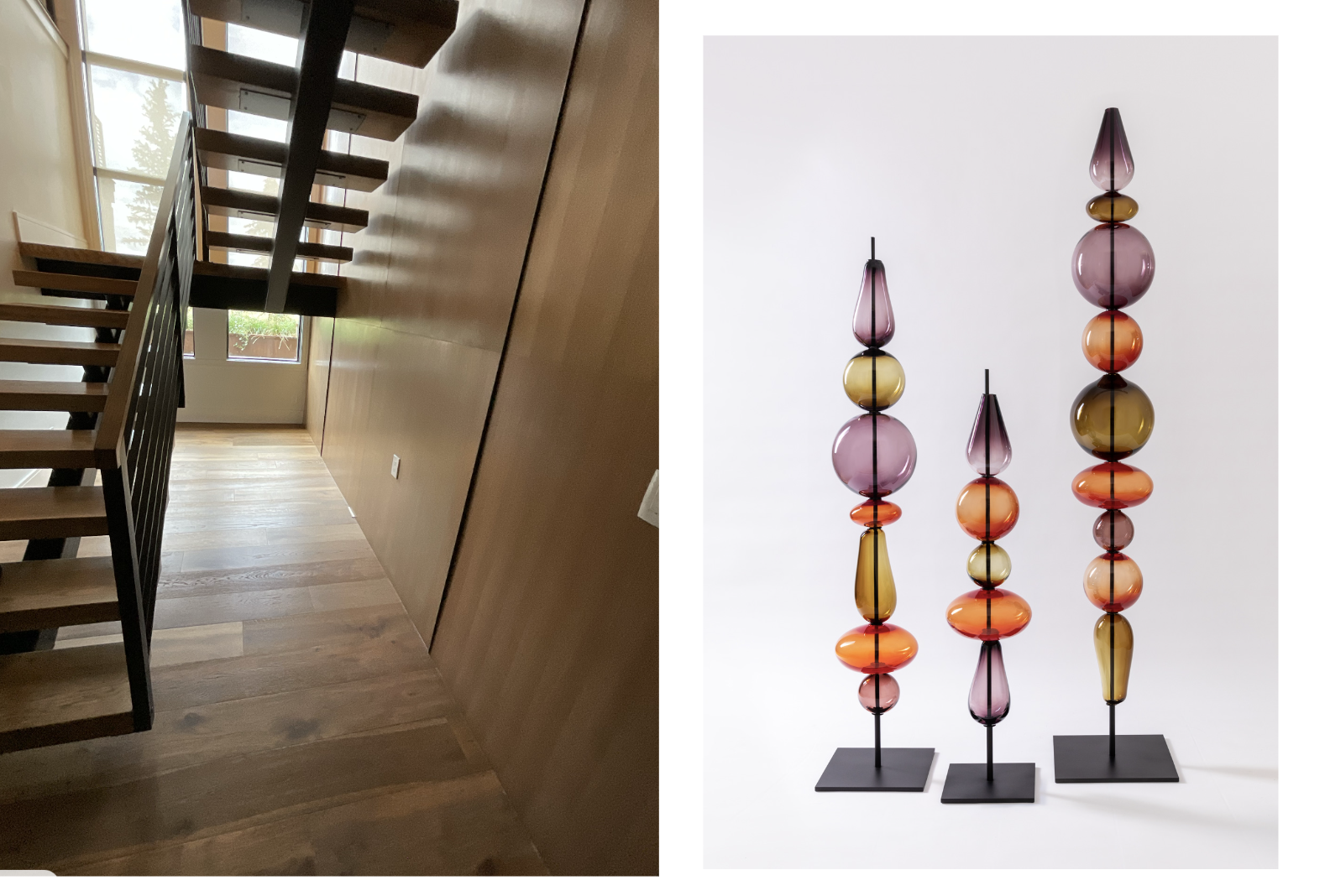 use the exact sculptures on the left and put them in the open space under the stairs use the taller one for the middle and bring it forward some keep everything else the same