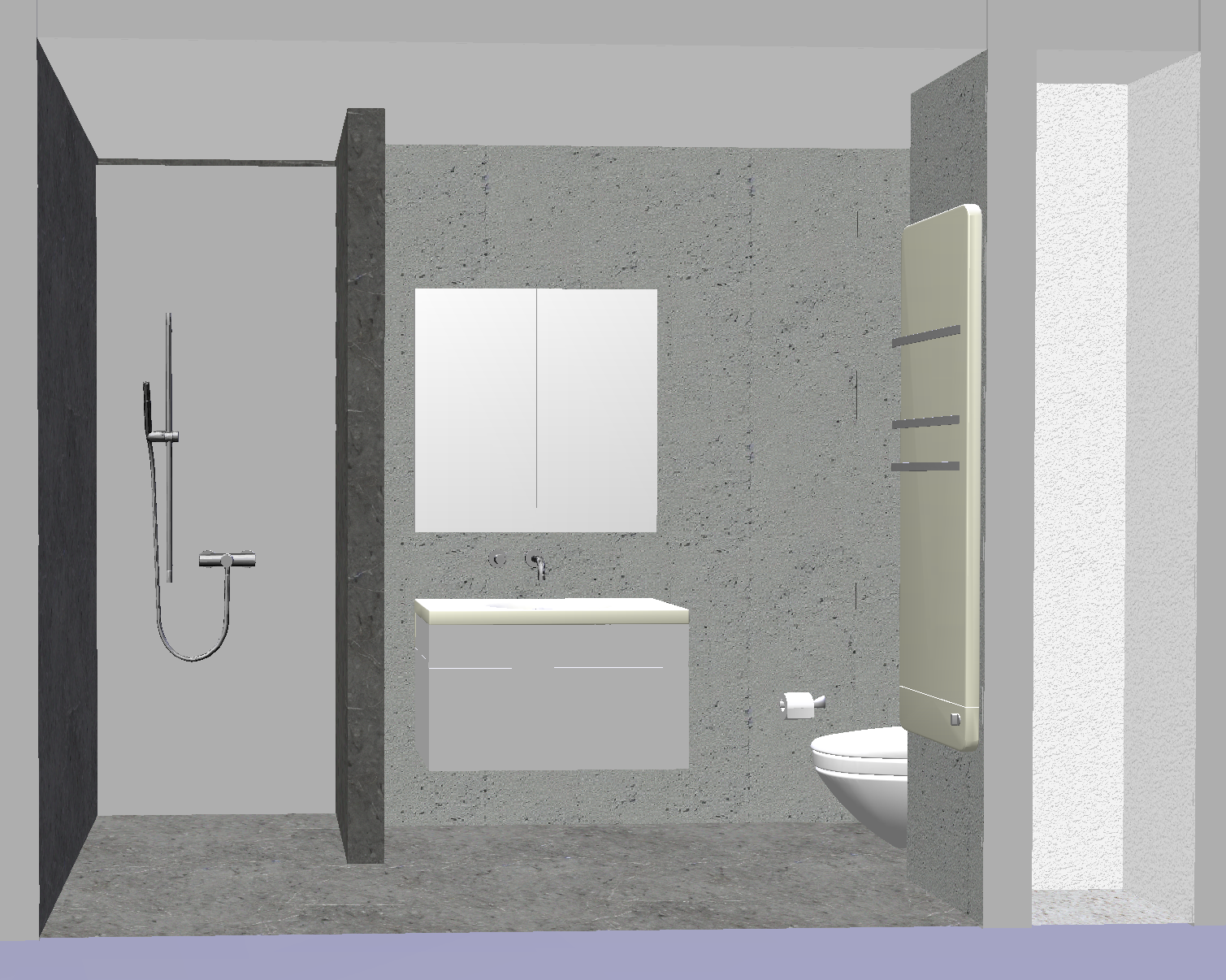 genau dieses rendering berarbeiten fotorealistisches innenraum foto exakt gleiche perspektive und kameraposition wie das hochgeladene referenzbild 100 identische raumgeometrie exakt gleiche m belanordnung weiches nat rliches tageslicht leicht schr g einfallende sonne ganzer raum zus tzlich k nstlich ausleuchten sanfte realistische schatten blickrichtung ist nach osten sonnenlicht kommt von s den realistische materialien echte holztexturen stoff mit leichten gebrauchsspuren hochwertige oberfl chenreflexionen lavabo inklusive unterbau aus marmor collemandina grigio in braungrau dunkel lavabo innen ebenfalls collemandina im unterbau im obersten drittel eine griffmulde ber die ganze breite unterbaum bel mit unterbaubeleuchtung hinter dem lavabo eine vola wandarmatur in edelstahl geb rstet vollkommen rahmenloser und bis auf f nf zentimeter versenkter und hinterleuchteter spiegelschrank mit spiegelung links neben dem lavabo ist die dusche thermostatmodul axor select mit stabhandbrause und grosser wandtellerbrause alles in edelstahl geb rstet vertikales led ber die ganze raumh he ganz links hinten in der dusche rechte seite in der dusche kein led w nde in der dusche und boden collemandina grigio in braungrau alle anderen sichtbaren w nde sind sichtbeton die toilette ist in der nische hinten auf der rechten seite moderne toilette vertigo wandh ngend in farbe weiss matt tecelux bet tigungsplatte toilettenpapierhalter in edelstahl mit papier an der wand links von der toilette an der grossen wand handtuchradiator in edelstahl an der fl gelwand auf der rechten seite mit weissen badet chern links und rechts vom lavabo handtuchstangen und handt cher in weiss schwarze steckdose rechts vom lavabo schwarze runde deckeneinbauspots in der nische vorne rechts ist ein unsichtbarer schacht ohne irgendwelche installationen sehr moderner minimalistischer look nat rliche farbwiedergabe golden hour feeling das bild muss wie eine professionelle fotografie aussehen es soll ein echtes und reales foto sein canon eos r5 35 mm festbrennweite f 2 8 hyperrealistisch dslr qualit t raw aufnahme 8k aufl sung extrem scharf perfekte tiefensch rfe professionelle architekturfotografie