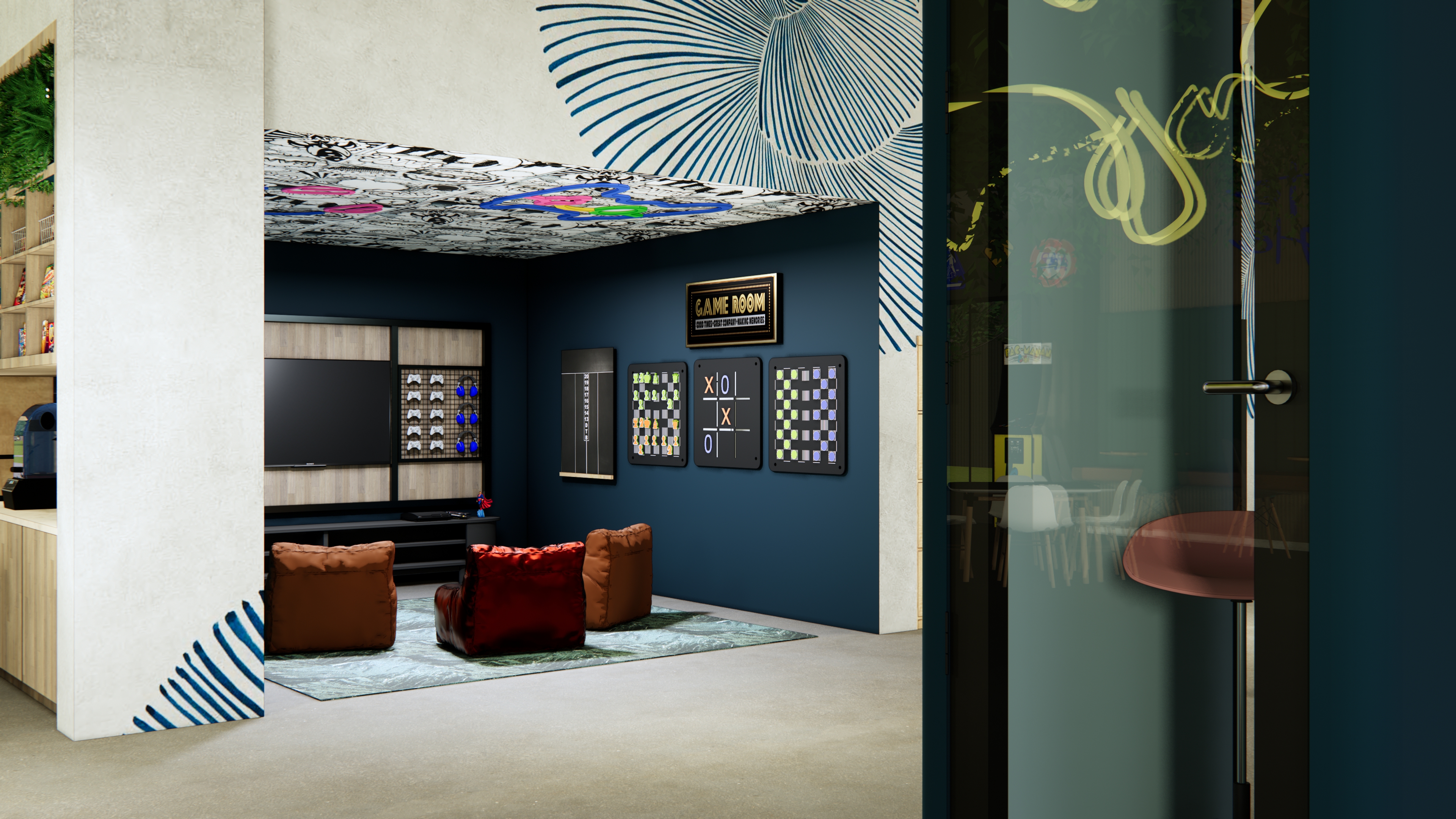 ceiling should be comic book style graphics with neon shapes laid on top dont let the ceiling finish extend past the blue wall
