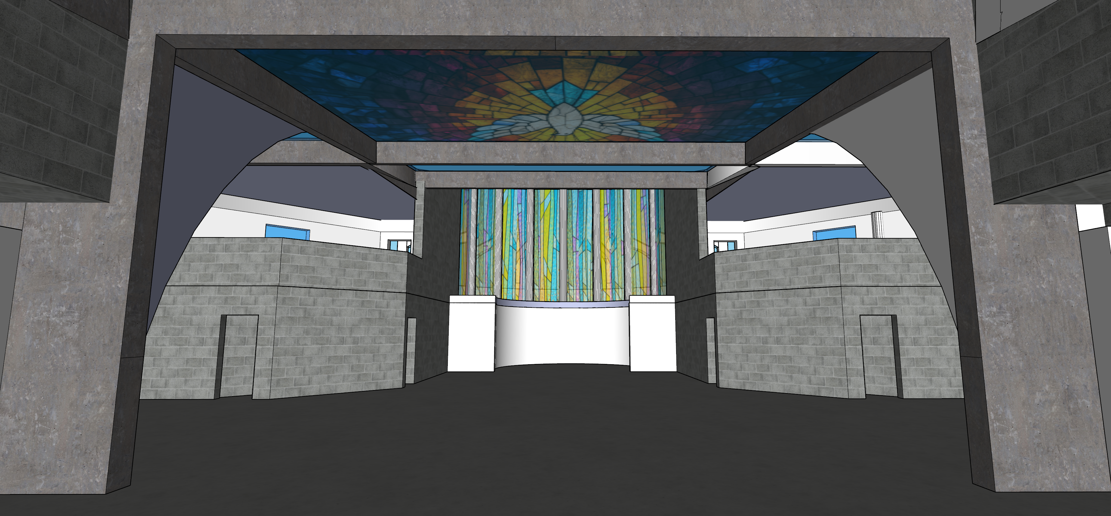 render this interior as a bright heavenly roman catholic nave where the entire architectural experience revolves around the idea that god is light preserve the exact geometry from the sketchup screenshot including the curved apse wall choir platform gallery walls concrete arches and the large stained glass skylight above the crossing apply polished architectural materials throughout smooth high grade cast concrete for all structural columns and arches finely finished concrete brick for the lower perimeter walls and light polished marble for the altar platform and liturgical elements matching the interior view reference illuminate the space with intense uplifting daylight pouring through the stained glass ceiling panels using the same color palettes and compositions seen in the exterior roof reference project vibrant reds blues golds and radiant white light onto the polished concrete surfaces to create a sacred ascending atmosphere ensure the lighting emphasizes upward movement soft glowing celestial illumination that draws the eye toward the stained glass ceiling and apse maintain bright clean global illumination with minimal shadows to reinforce the theme of divine light keep the camera position and all architectural proportions exactly as shown in the screenshot preserving realism and material accuracy