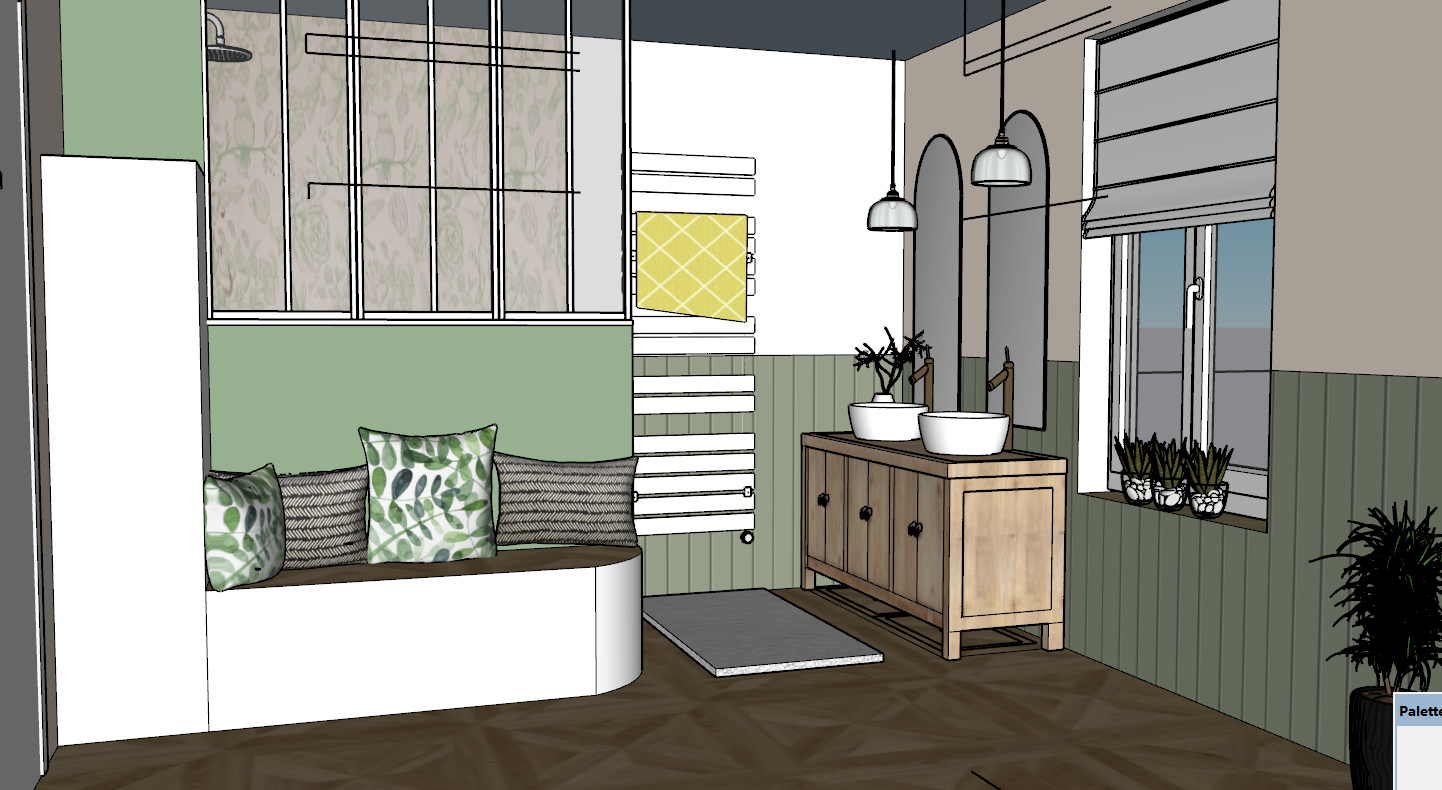 verri re blanche sur muret banquette lisse blanche avec coussins look campache chic shabby chic soubassement lambris vert sauge meuble bois parquet marqueterie