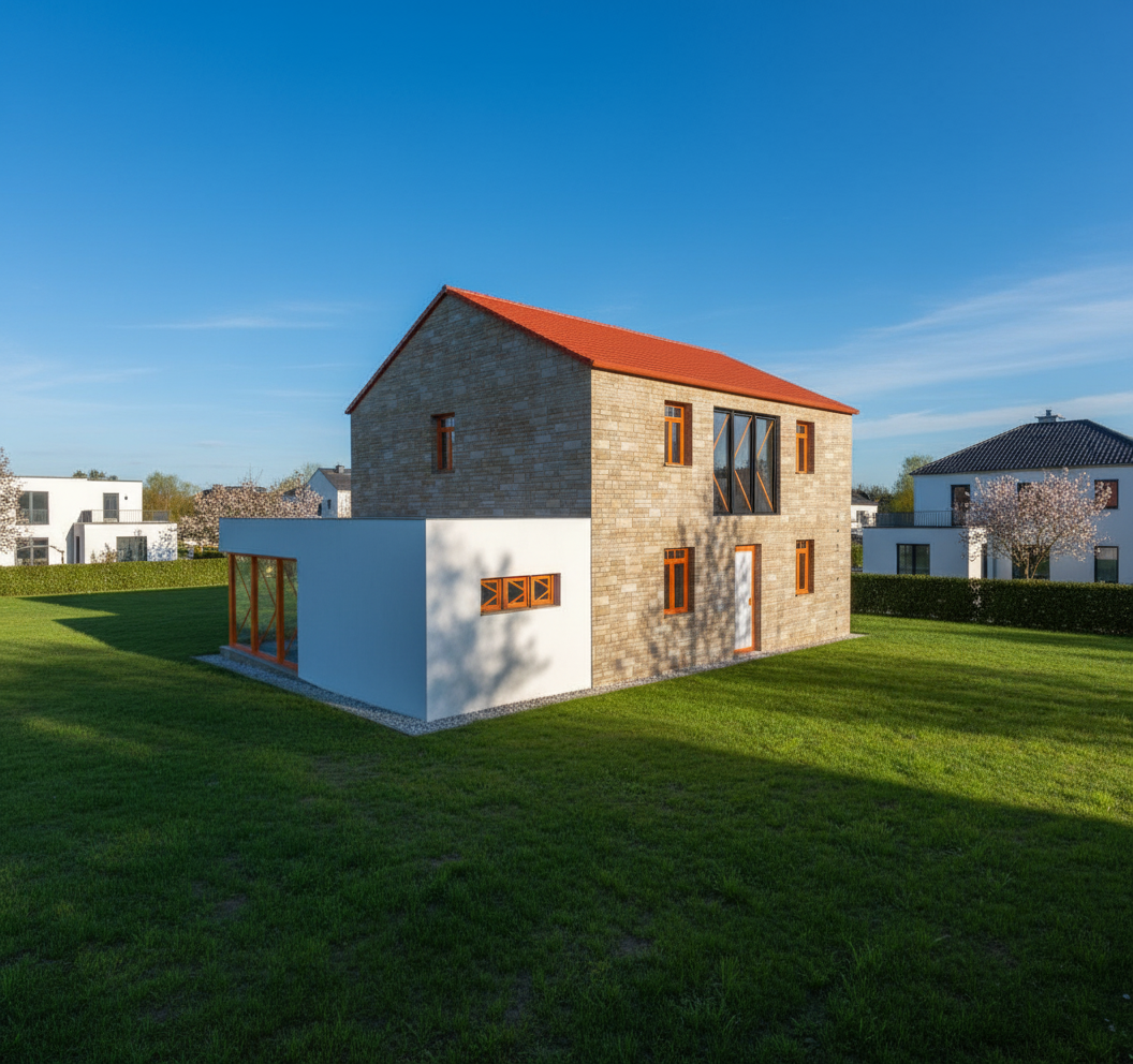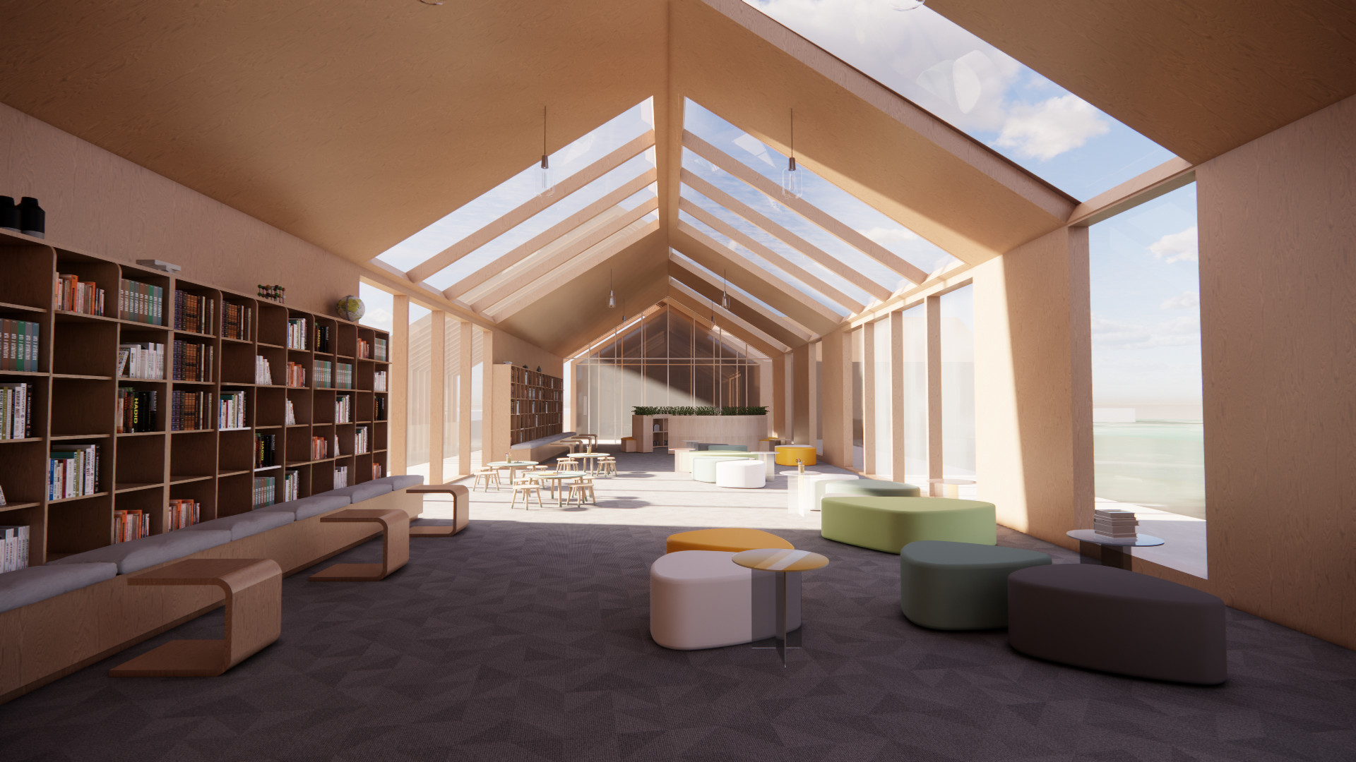enhance realism of an architectural interior render while strictly preserving geometry layout and camera position refine materials with subtle variation add natural wood grain detail and slight reflectivity to timber surfaces and improve carpet flooring with soft texture variation gentle directional shading and realistic light absorption balance lighting by maintaining strong natural daylight from skylights while slightly lifting shadows in the foreground for clarity add soft ambient occlusion at edges and contact points to increase depth improve glass realism with subtle reflections and accurate transparency enhance the exterior view with a soft slightly hazy landscape and balanced exposure introduce very light atmospheric depth and gentle light bloom near skylights maintain a clean minimal high end architectural photography style
