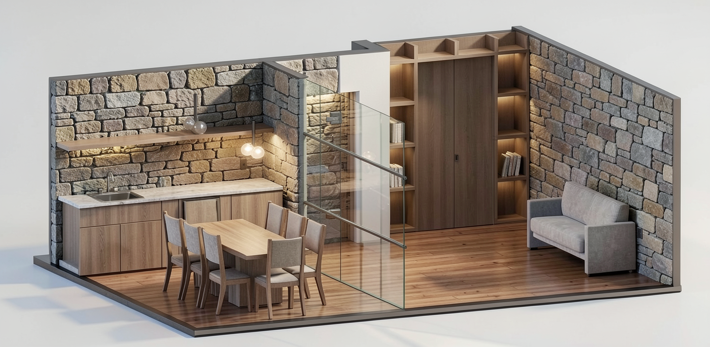 modernist exterior shot using this flooring swatch use it to create a cafe room scene make it cute modern and keep the flooring excat color and pattern architecture