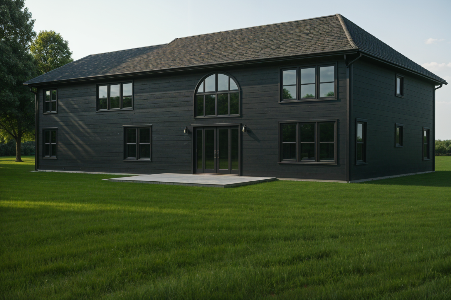 dark blue thinner siding black window trim black gutters new black shingled roof