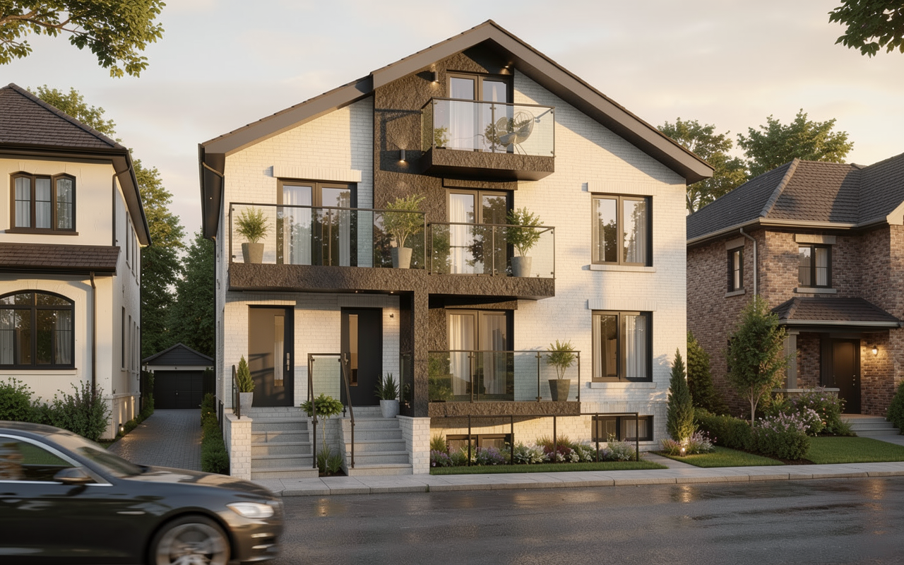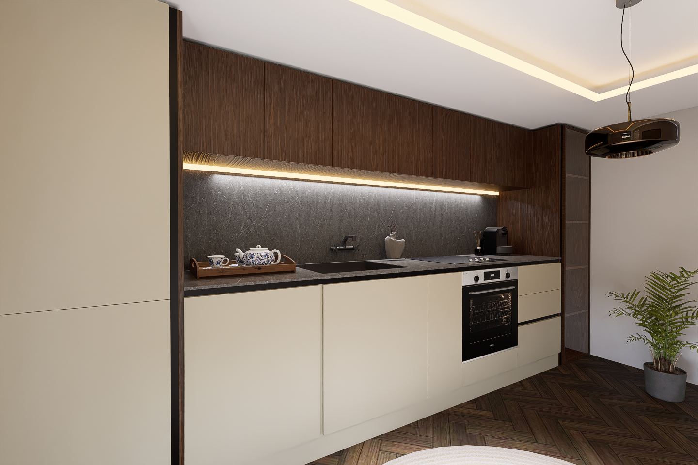 ultra realistic interior render of a modern compact kitchen from an angled perspective keep exact layout proportions materials and design unchanged lower cabinetry in smooth matte beige finish handle less with clean shadow gaps and precise alignment built in oven and cooktop remain in exact position upper cabinetry in dark warm wood with vertical grain direction not horizontal rich natural texture matte satin finish with subtle tonal variation underside of upper cabinets also follows the same wood logic with realistic grain continuation integrated under cabinet led strip lighting 3000k soft continuous and evenly diffused backsplash dark stone surface with fine texture slightly matte with subtle reflections and natural imperfections countertop in matching tone with realistic thickness and edge detail left side tall storage unit in light neutral matte finish minimal and seamless right side continuation of wood cabinetry and vertical glass cabinet with dark frame keep subtle reflections no clutter inside foreground right indoor plant in simple pot natural but not overly detailed keep as secondary element ceiling recessed perimeter led lighting warm indirect glow with smooth gradients pendant light above with glossy black finish accurate reflections and subtle highlight control floor dark herringbone wood flooring with rich variation realistic grain direction slight sheen and depth lighting cinematic but controlled warm ambient lighting mixed with soft task lighting balanced exposure no blown highlights realistic shadows and bounce light add ambient occlusion and contact shadows for depth styling minimal and premium small tray with teapot set on the left coffee machine on the right keep everything clean and intentional rendering ultra high resolution sharp details physically accurate materials no distortion no redesign no added elements beyond subtle styling