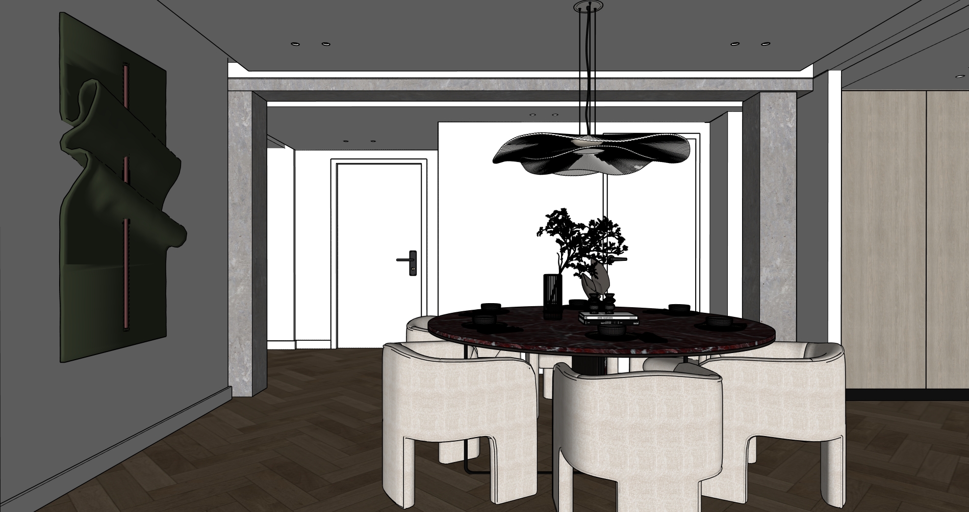 crea una imagen fotorealista a partir de este sketchup realza las texturas e iluminacion la lampara es blanca la escultura verde de la izquierda en plastica mas oscura el palito que la cruza es un led burdeos