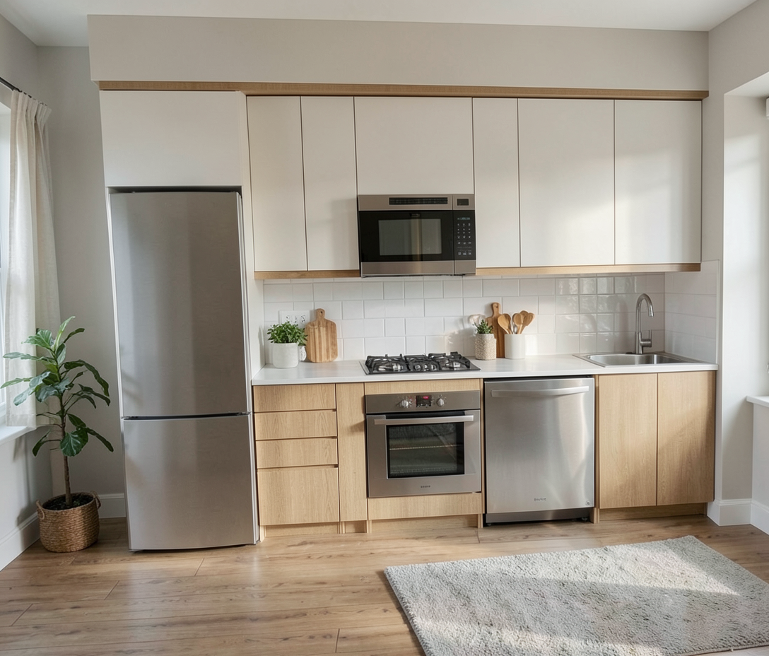 white stucco render dark grey window frames dark grey tile roof clean lawn in the foreground orchard in the background forest further in the background