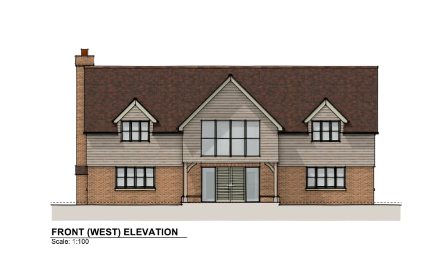 genenerate a hyperrealist visual using matthews light multi bricks in flemish bond little green portland stone colour windows rustic oak cladding at first floor and the roof is a handmade clay tile it is a house so add wild planting and grass and set it i amoungst trees in the bacground
