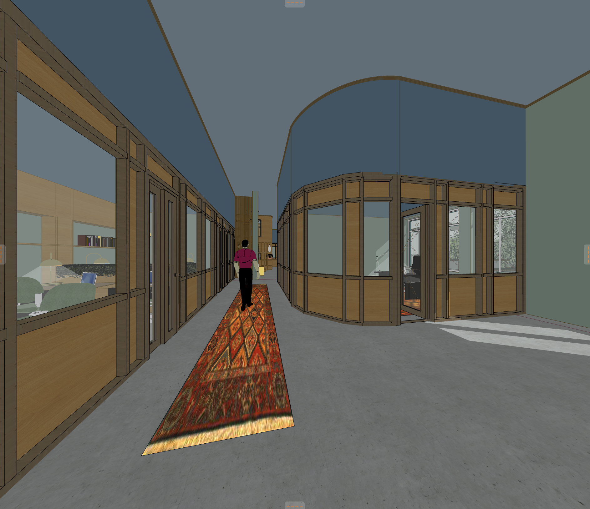 a sophisticated modern office space with sleek wooden paneling in warm oak tones features green ergonomic office chairs placed at dark marble topped desks laptops are open on each desk displaying a vibrant blue screen above stylish pendant lights cast a soft golden glow complementing the dark slate blue ceiling shelves on the right hold an array of colorful books enhancing the creative atmosphere a lush green plant wall provides a refreshing natural touch the ambiance is professional yet inviting with neutral walls balancing the space