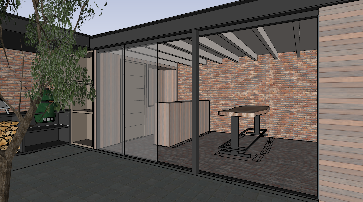 add people grasses a bar counter with stools soft ambient lighting and a string of festoon lights outdoor bistro lights hanging overhead creating a warm evening glow add a couple of colorful vintage enamel signs and enamel plates