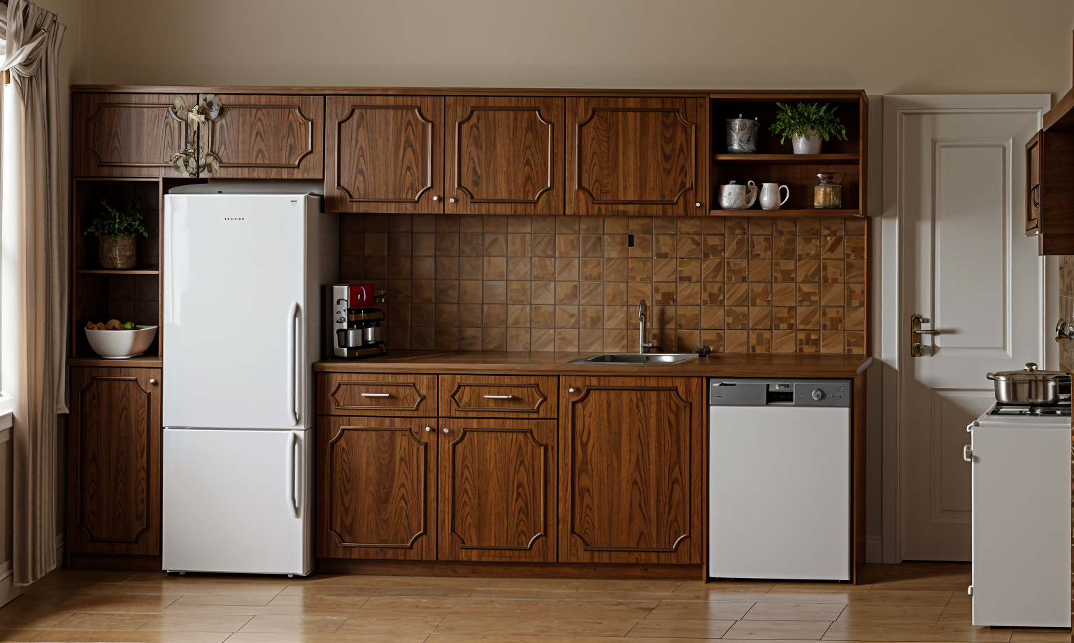 realistically render this drawing white cabinets with a 1 shaker reveal flooring to be 2 oak in a honey color hardware is brushed gold upholster the barstools in a blue boucle fabric and make the barstool wood a light walnut counter tops render as taj mahal quartzite this quartzite is a soft yellow color make sure to maintain the step down at the island that is shown by the line add undercounter lighting and lighting at the island where the barstools are at the toe kick near the floor add undercounter lighting and lighting at the floating shelves over the sink