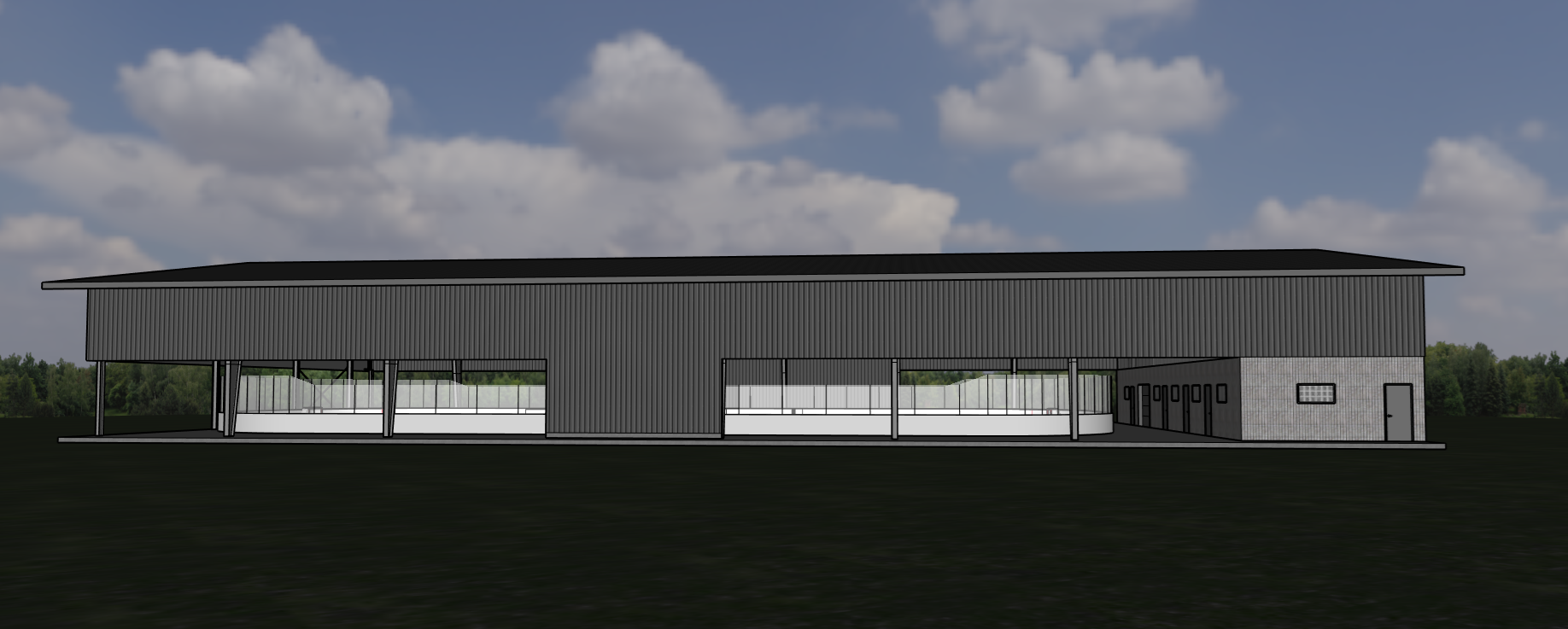 a hockey arena in a steel prefabricated building steel siding and grey ribbed brick veneer keep geometry show an asphalt parking lot in front with yellow parking lines muskoka forest close behind the building don t change geomettry