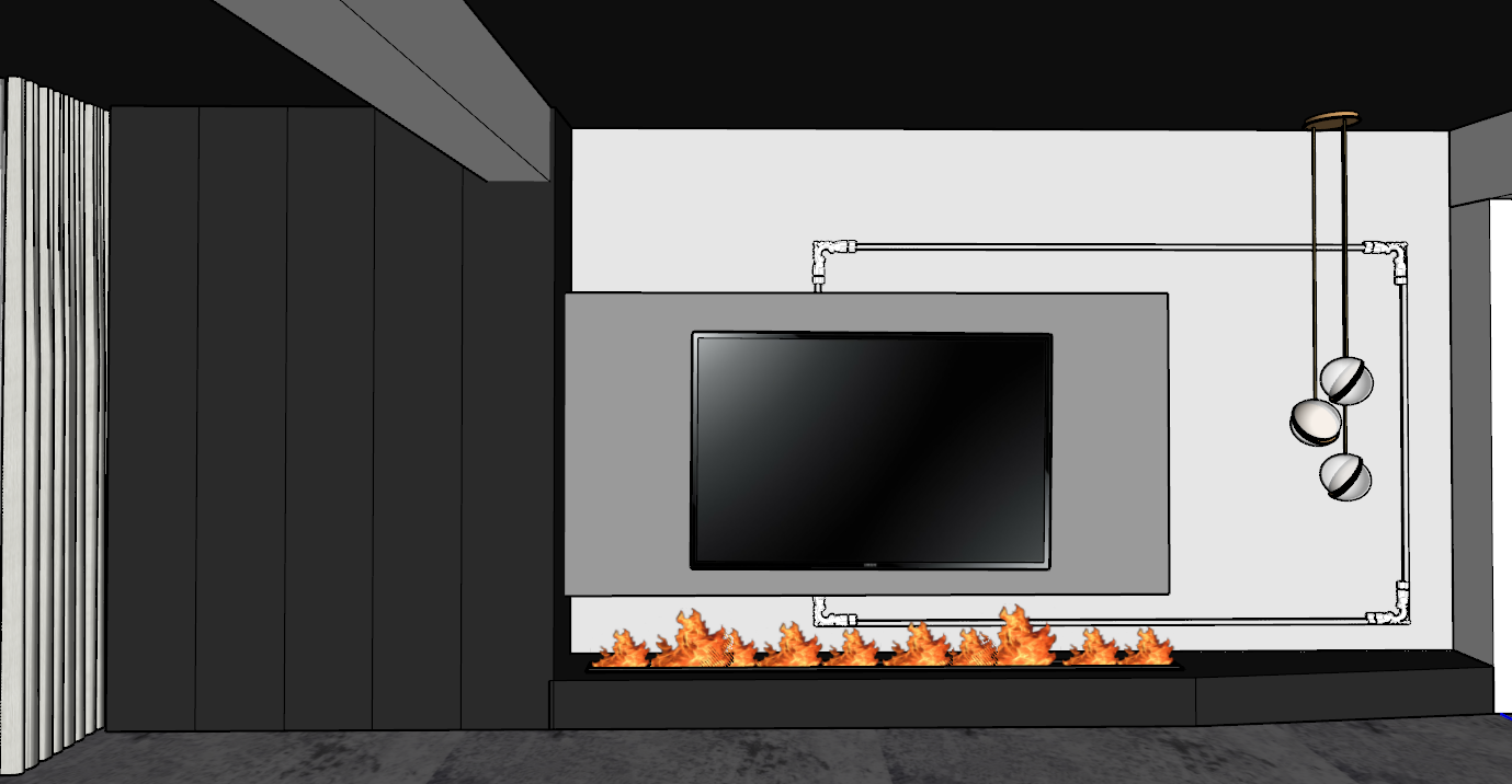 interior shot create an elegant living room tv wall design in modern manor but with elegant elements on the cabinet under the tv there in an open modern fireplace add textures and lamps and ambiental lights