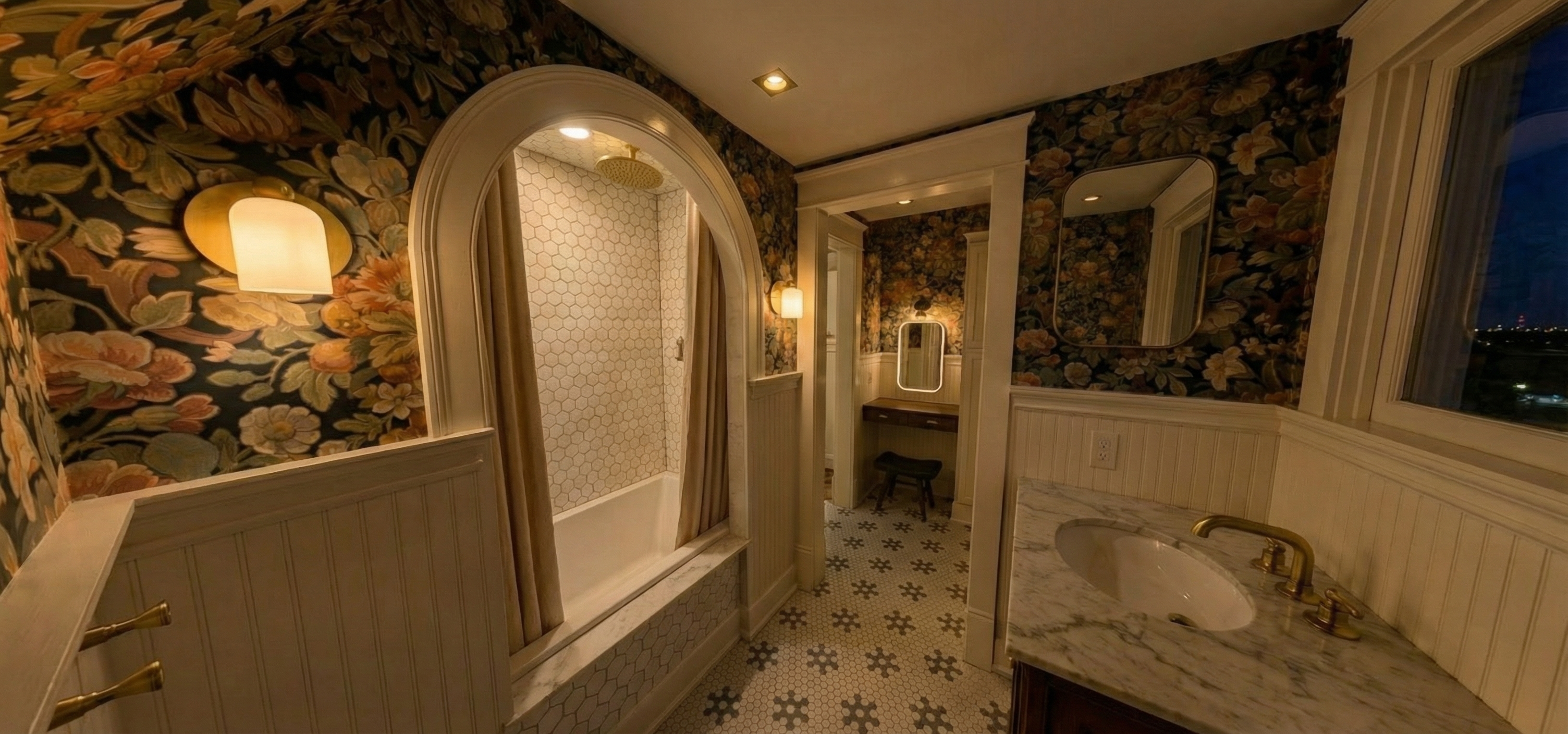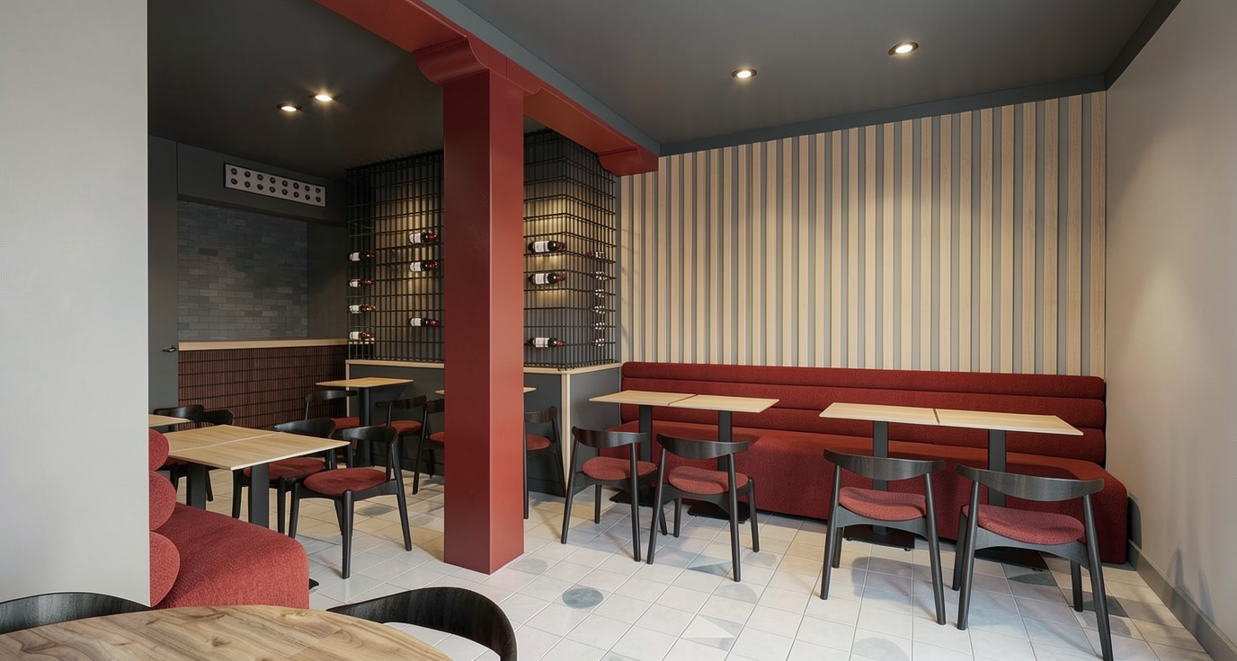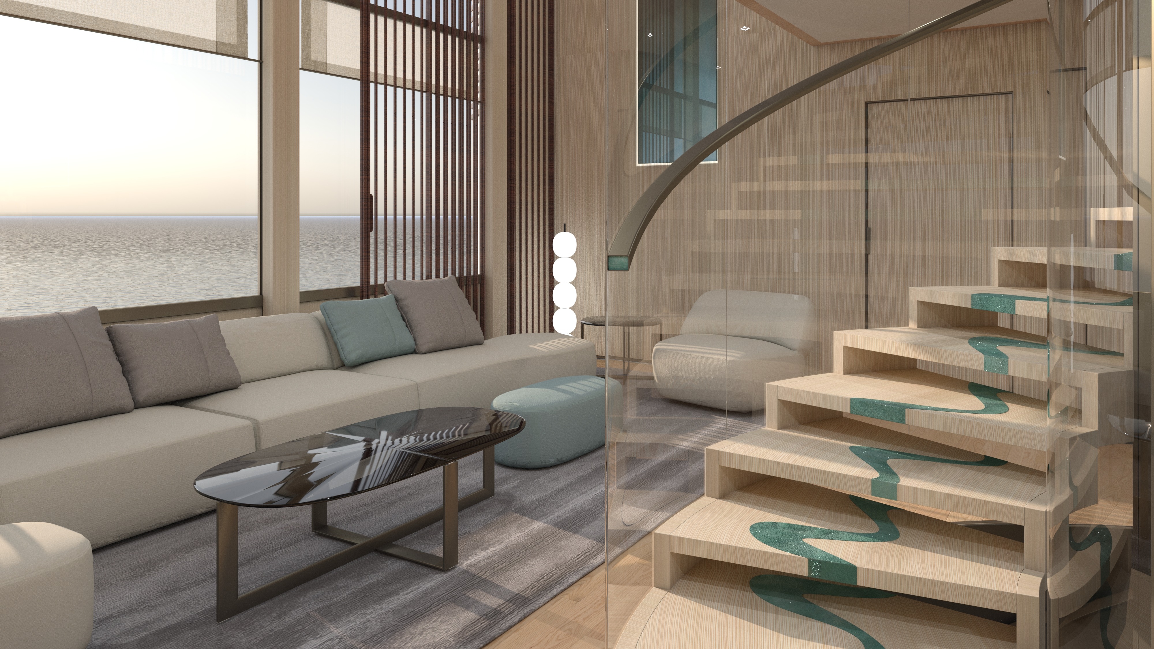 keep the entire architecture lighting staircase furniture flooring ceiling and color palette of this rendering in the back wall where two framed artworks currently hang left and right remove those artworks and replace only those two vertical recessed wall panels with refined hainan huanghuali wood panels on each huanghuali panel carve the li brocade pattern continuously from ceiling to floor with elegant shallow relief adjust the color tone of the huanghuali panels to match the warm reddish brown tone of the brise soleil wood in the scene ensuring harmony add soft vertical concealed lighting above or beside each carved panel to enhance pattern perception through subtle light and shadow contrast do not modify any other surface material or architectural element only edit these two vertical recessed niches to make them consistent with the architectural solution seen in the second rendering