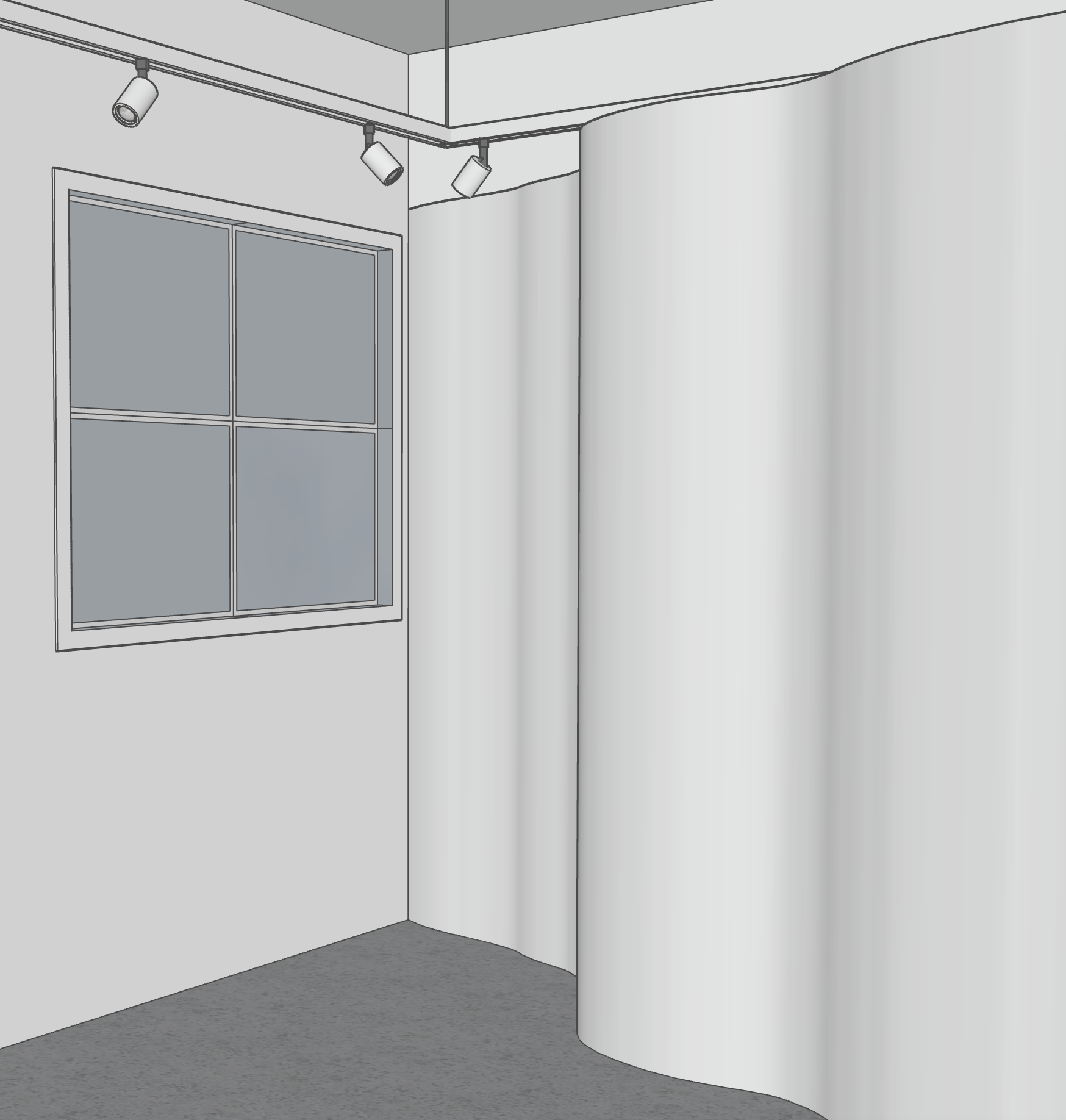 floor is concrete spot rails in ceiling is white the door is a mirror