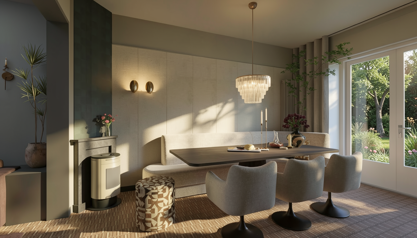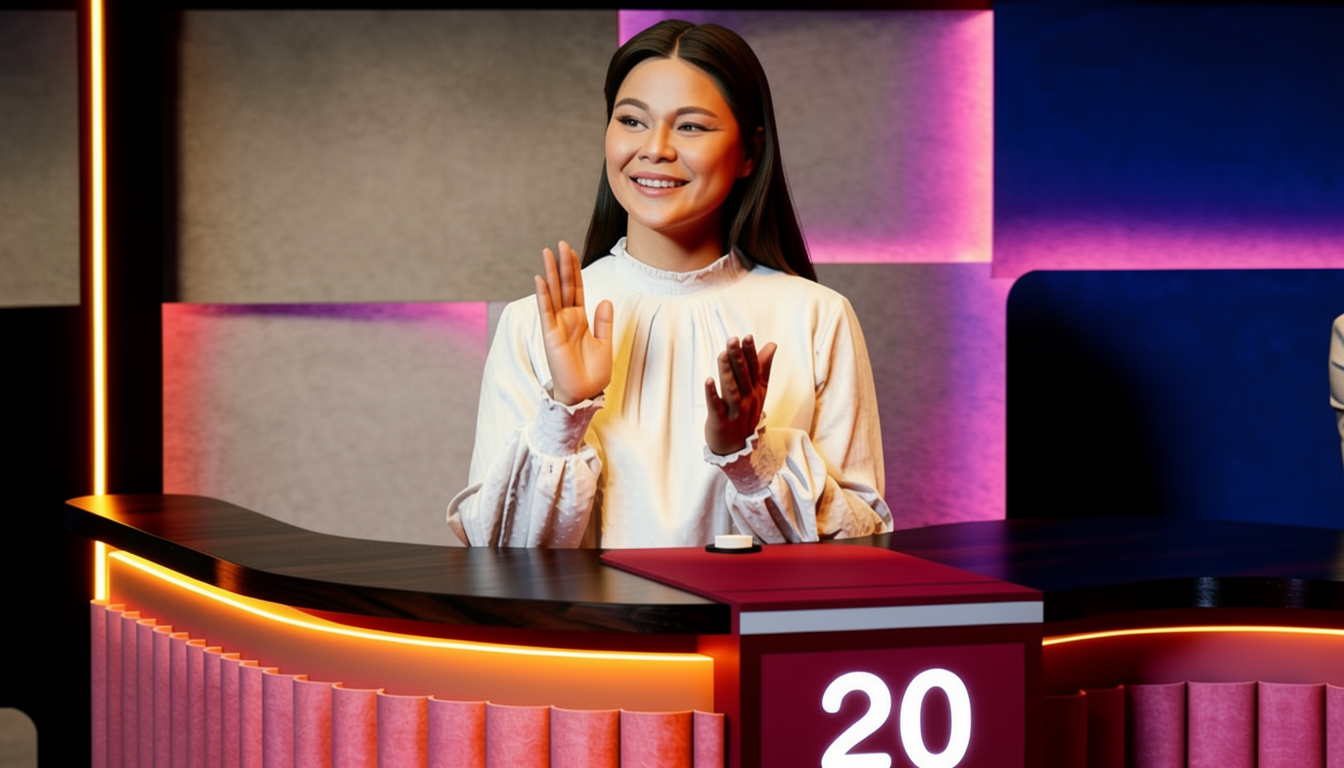 a high end tv studio production shot of a game show contestant rendered with cinematic photorealism the lighting is highly saturated and dramatic featuring a white led key light focused directly on the woman to give her the crisp professional studio look she is wearing a white high neck blouse and is smiling while clapping the podium is crafted from dark polished wood featuring an amber orange neon led strip running along the top edge of the pink fluted base a central maroon display box shows the number 20 glowing with a bright clean white light the background wall consists of large overlapping geometric panels with a beige grey felt texture these panels are backlit with powerful led washes in deep purple and sapphire blue creating a rich saturated glow that bleeds onto the felt surfaces the overall atmosphere maintains high contrast deep shadows and vibrant color saturation with a sharp focus on the contestant and a subtle bokeh effect on the background panels 8k resolution path traced professional broadcast lighting