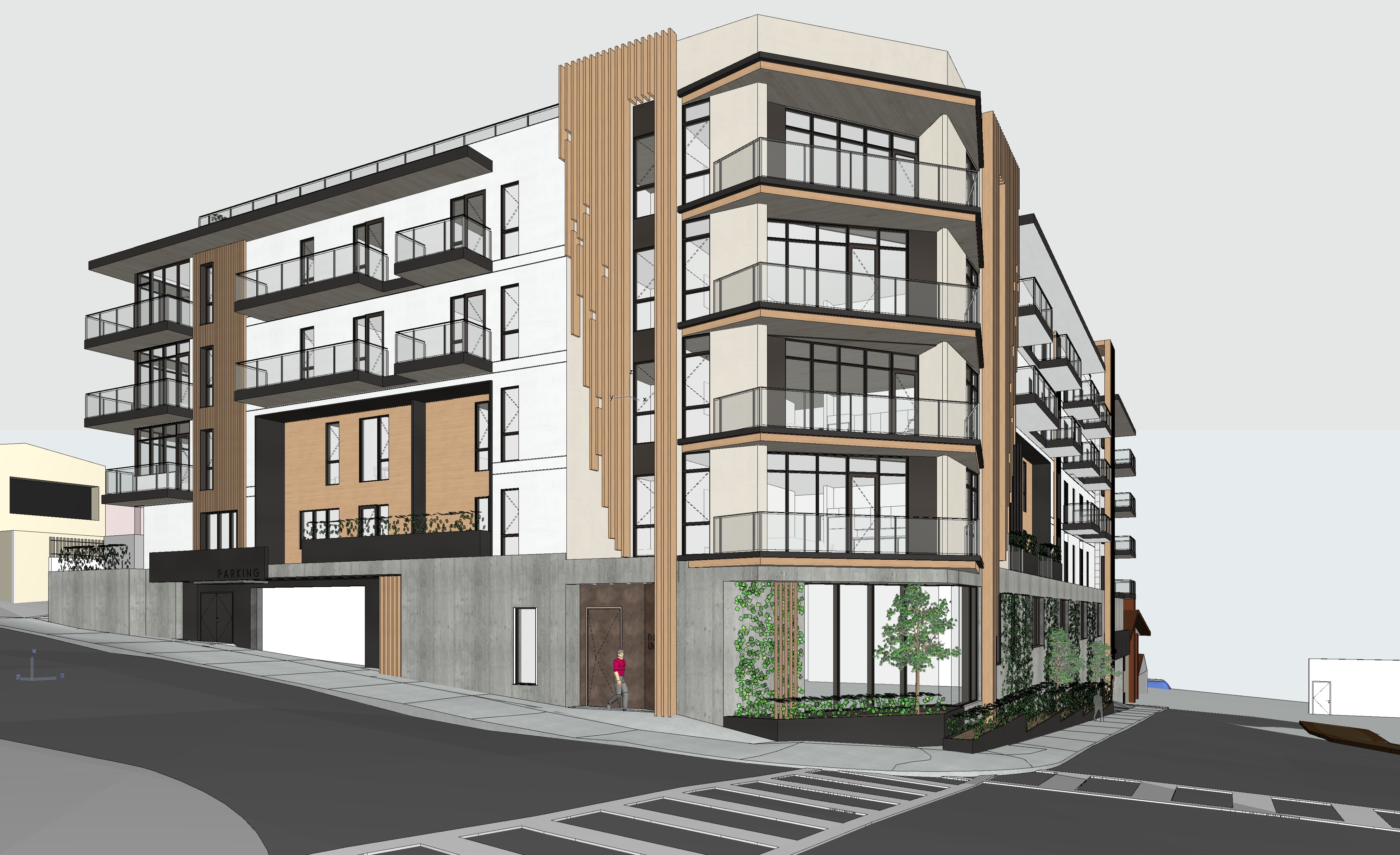 bright sunny skies with lens flare sun shining through left side of image board form concrete base smooth trowel white stucco blackened metal accents